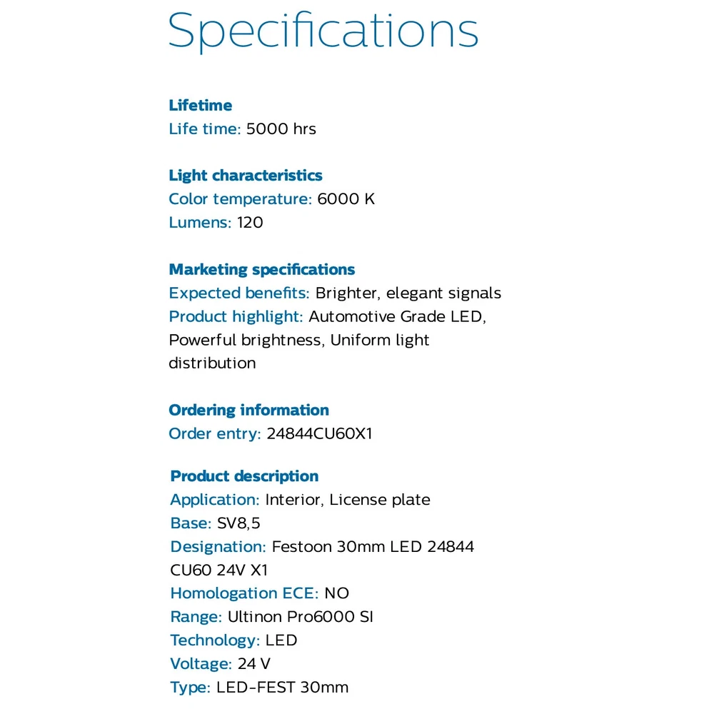 Philips LED C5W Festoon 30mm Truck 24V Fest Interior Signal License plate Lamp For a stylish driv e , upgrade to Philips Ultinon Pro6000 LED 30mm festoons for interior lighting. The strong 6000 K bright white light illuminates the inside of your truck while being kind to your eyes. Features and benefits -Illuminate your truck interior with bright LED bulbs -Optimized for enhanced visibility -High-end, stylish signaling -Upgrade your lights, upgrade your style -Performance made to last -Enhanced lifetime of up to 5,000 hours -Simple plug-and-play replacement -Easy to install and compatible with most car models Specification - Number of Bulb: 1 - Fitting: C5W Festoon 30mm - Lumens: 120LM - Bulb Type: Styling - Technology: LED - Kelvin Rating: 6000K cool white - Voltage: 24V - Base: SV8.5 - Range: Ultinon Pro6000 LED - SKU: 24844CU60X1 - Condition: New - Lifetime: 5000 hours CANBus Compatibility Rating The Pro6000 range is designed to be compatible with most CANBus systems however please remember that CANBus free bulbs are never guaranteed. For more stubborn CANBus systems, you will need to fit a resistor kit to eliminate any warning errors that do decide to pop up.