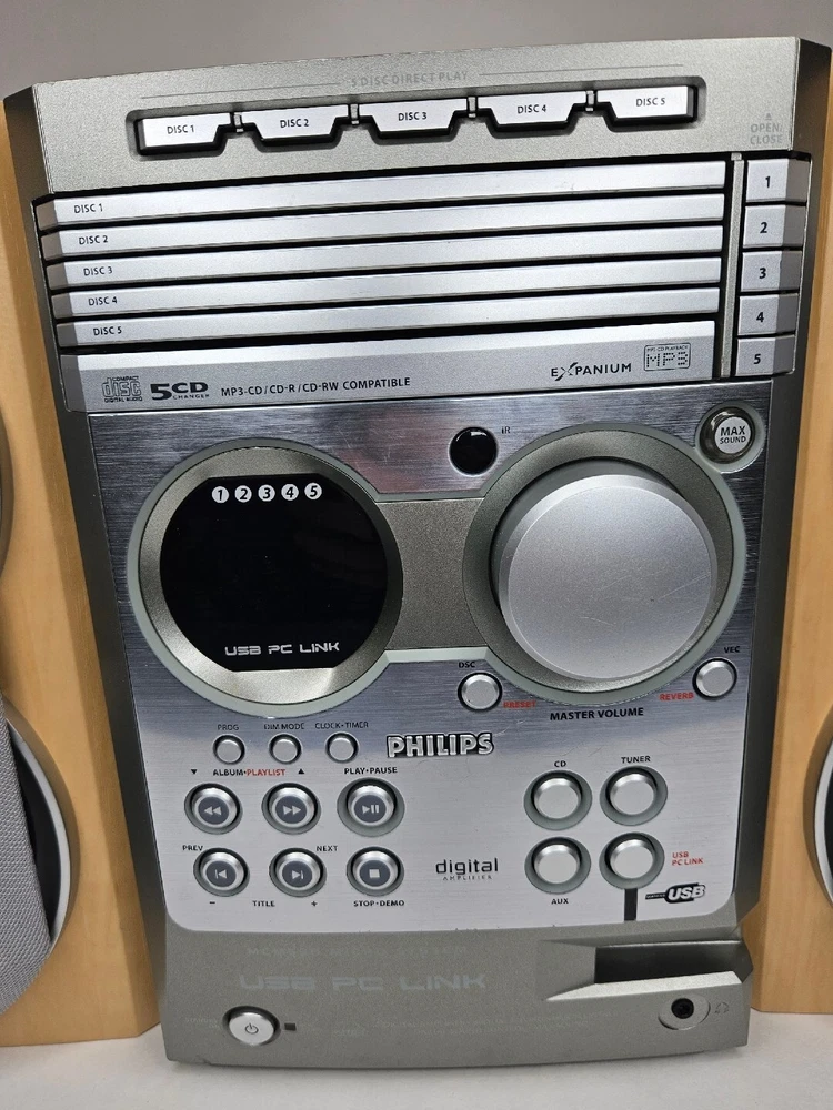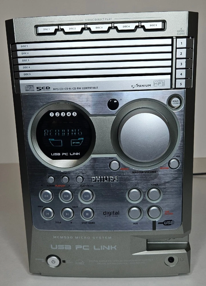 Connectivity: USB 2.0 Brand: Philips MPN: MCM530 Year Manufactured: 2004 Playable Media Format: CD, CD-R, CD-RW, MP3 Audio Outputs: Stereo L/R RCA Features: CD Changer CD Changer Capacity: 5 Model: Philips MCM 530 / 37 Type: CD Changer Color: Multicolor Product Line: Philips