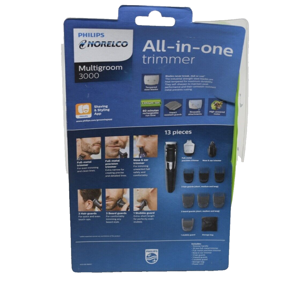 Philips Norelco Multigroom All In One Series 3000 13 attachments NEW Slight Dmg Box (1) Philips Norelco Multigroom All In One Series 3000 13 attachment trimmer 13 pieces for all of your grooming needs: Beard and stubble trimming and maintenance, precision trimmer allows exact placement for sharp lines, nose and ear trimmer taking care of unwanted hairs DualCut technology: 2x more self-sharpening blades. The steel blades sharpen themselves as they work Easily clean blades and guards by detaching from handle and rinsing under water Powerful lithium battery delivers up to 60 minutes of run time.