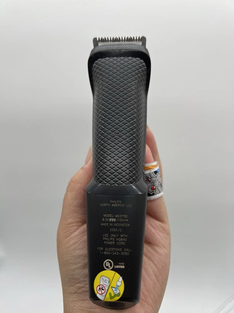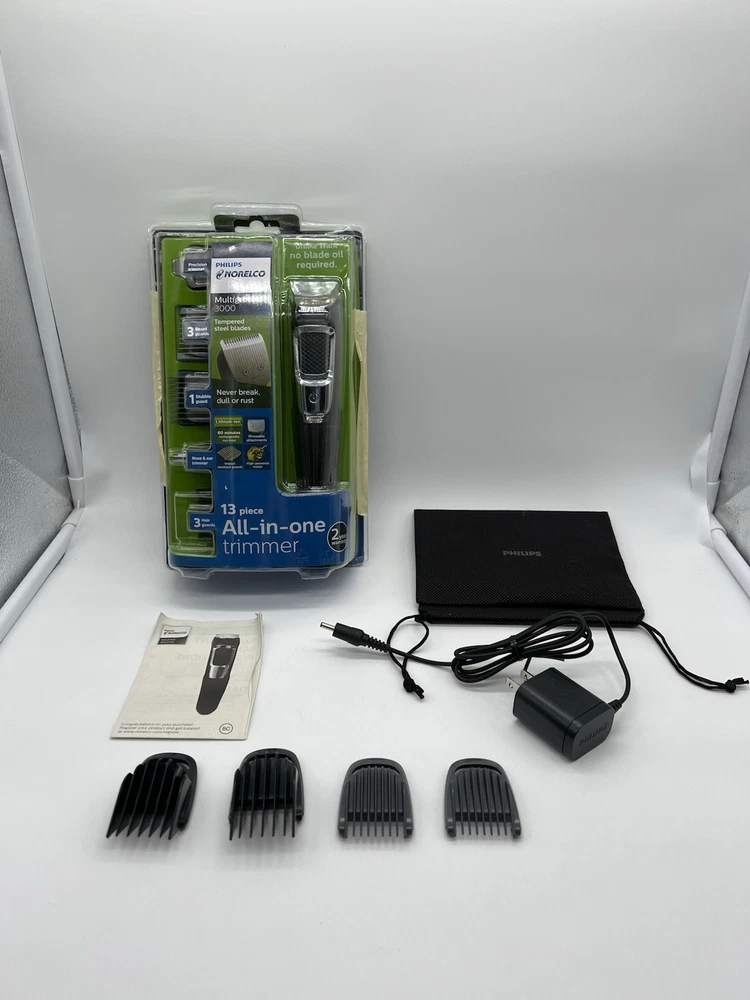 Philips Norelco Multigroom Trimmer, Series 3000, MG3750 ( R4(7) Used, Tested it works. The DualCut trimmer blades sharpen themselves as they work, resulting in longer lasting, maintenance-free blades. Unlike the competition, NO BLADE OIL IS NECESSARY. Steel blades and guards are easy to detach and rinse, allowing for quick cleaning without worrying about rust. Rechargeable lithium ion battery offers 60 minutes of use. The trimmer can be used even while charging, or after a 5 minute quick-charge. Use for all hair types, moustaches, and beards. Includes: Steel trimmer, steel precision trimmer, nose and ear trimmer, 3 hair trimming guards, 3 beard trimming guards, stubble guard, accessory travel storage bag, and cleaning brush.