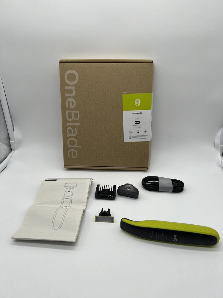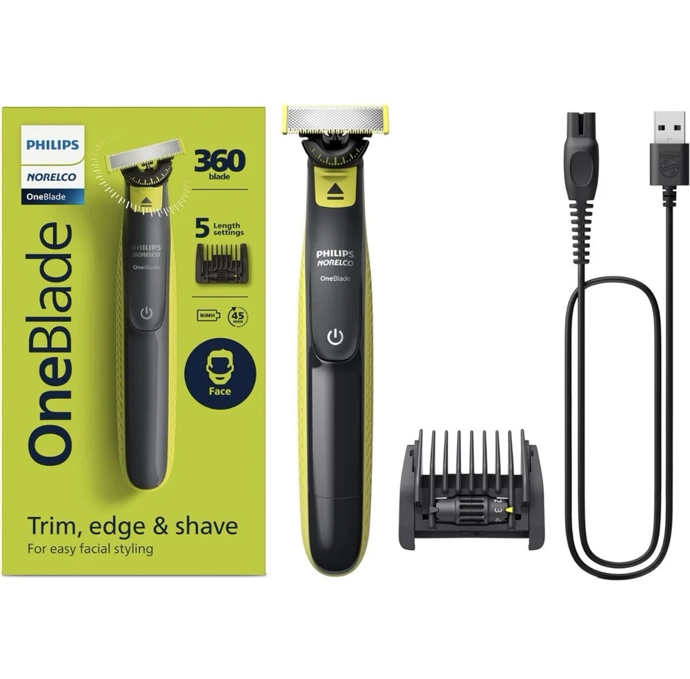 Philips Norelco OneBlade 360 Face Hybrid Electric Beard Trimmer QP2724/90 (Q7(4) It’s brand new, open box. OneBlade Technology: the fast-moving cutter (12,000x min) is efficient, even on longer hairs; the dual Protection System with glide coating plus rounded tips makes shaving easier and more comfortable Innovative 360 Blade: it can flex in all directions to enable constant skin contact and control; easily trim and shave, even the most difficult-to-reach areas with fewer passes and greater comfort¹ Designed to cut hair not skin: trim your beard to an even stubble length with the 5in1 comb (1-5mm), create precise edges thanks to the dual-sided blade, and shave off any length of hair easily Easy grooming anywhere: take it in the shower and use wet or dry; 45-minute battery with USB charging and compact handle make it the perfect travel companion The set includes: 1x Philips Norelco OneBlade 360, 1x 360 Blade, 1x 5in1 adjustable comb (1-5mm), 1x protection cap, 1x USB-A charging cable, a user manual (power adapter not included)