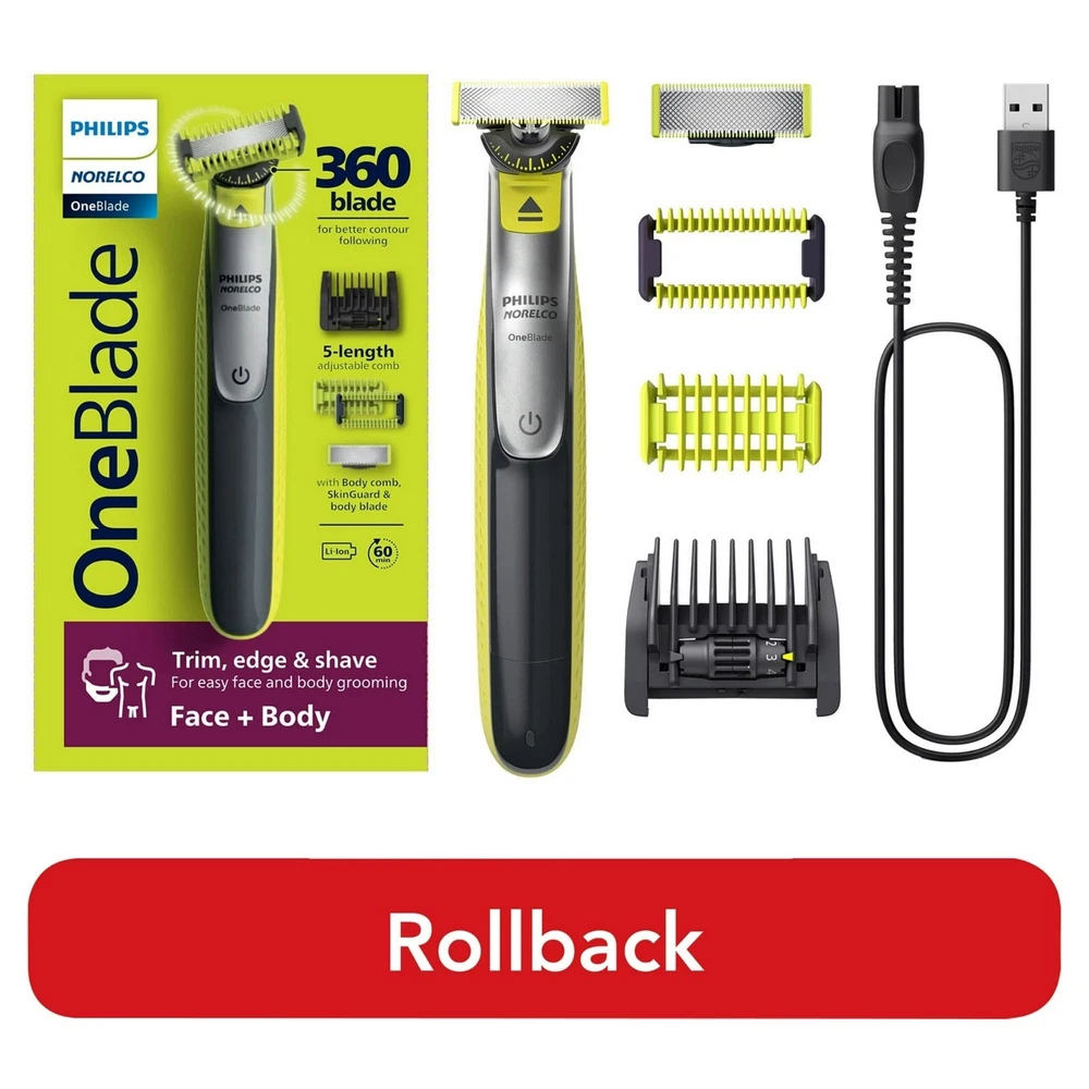 Philips Norelco OneBlade 360 Face + Body trims, edges and shaves any length of hair, even on body. OneBlade 360 Face + Body includes one blade for your face, and another blade with a click-on skin guard for your body. The unique OneBlade shaving technology integrates a fast moving cutter (12000x per minute) with a dual protection system to give you an efficient comfortable shave on longer hairs. The innovative 360 Blade can flex in all directions to adjust to the curves of your face. Easily trim and shave hard‐to‐reach areas — with few strokes and great comfort. OneBlade does not shave too close, so your skin stays comfortable. Click on the 5-in-1 stubble comb for face or use the additional blade with click-on skin guard and 3mm body comb for a fast and even trim on your body and below-the-belt. Forget about using multiple tools, OneBlade 360 Face + Body does it all. OneBlade is fully waterproof, so it is easy to clean. Just rinse it under the tap. You can shave wet or dry, even in the shower. No shaving foam needed. Stainless steel blade lasts up to 4 months of use** to keep that fresh feel. An eject icon will appear on the blade when it's time to consider changing the blade for the best shaving experience. The Lithuim Ion battery delivers up to 60 minutes of run time after a 4 hour charge. 1 handle, 1 360 blade for face, 1 blade for body, 1 5-in-1 comb for face, 1 skin guard for body, 1 body comb, 1 USB-A charging cord (adapter not included), 1 protective cap Rechargeable OneBlade 360 Face + Body can trim, edge, and shave any length of hair. Shave is not too close so your skin stays comfortable. The innovative 360 Blade can flex in all directions to adjust to the curves of your face. The design enables constant skin contact and control. Includes 2 blades, 1 360 blade for your face and 1 blade for your body. Use wet or dry, with or without foam. Click-on skin guard for extra protection on sensitive areas, even below the belt. Includes a 5-in-1 stubble comb + 1 body comb for an even trim on face or body Features Adjustable Brand Philips Norelco Assembled Product Weight 0.44 lb Manufacturer Part Number QP2834/70 Assembled Product Dimensions (L x W x H) 1.46 x 3.94 x 7.87 Inches