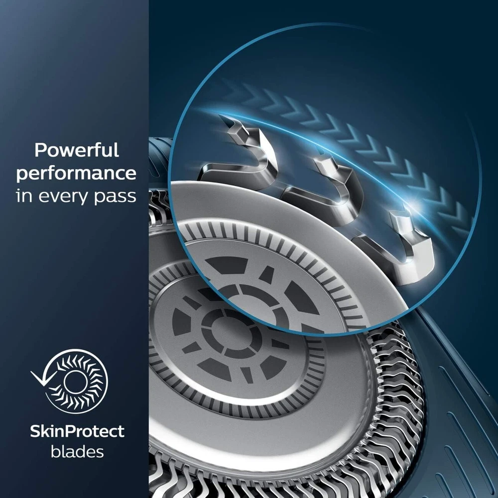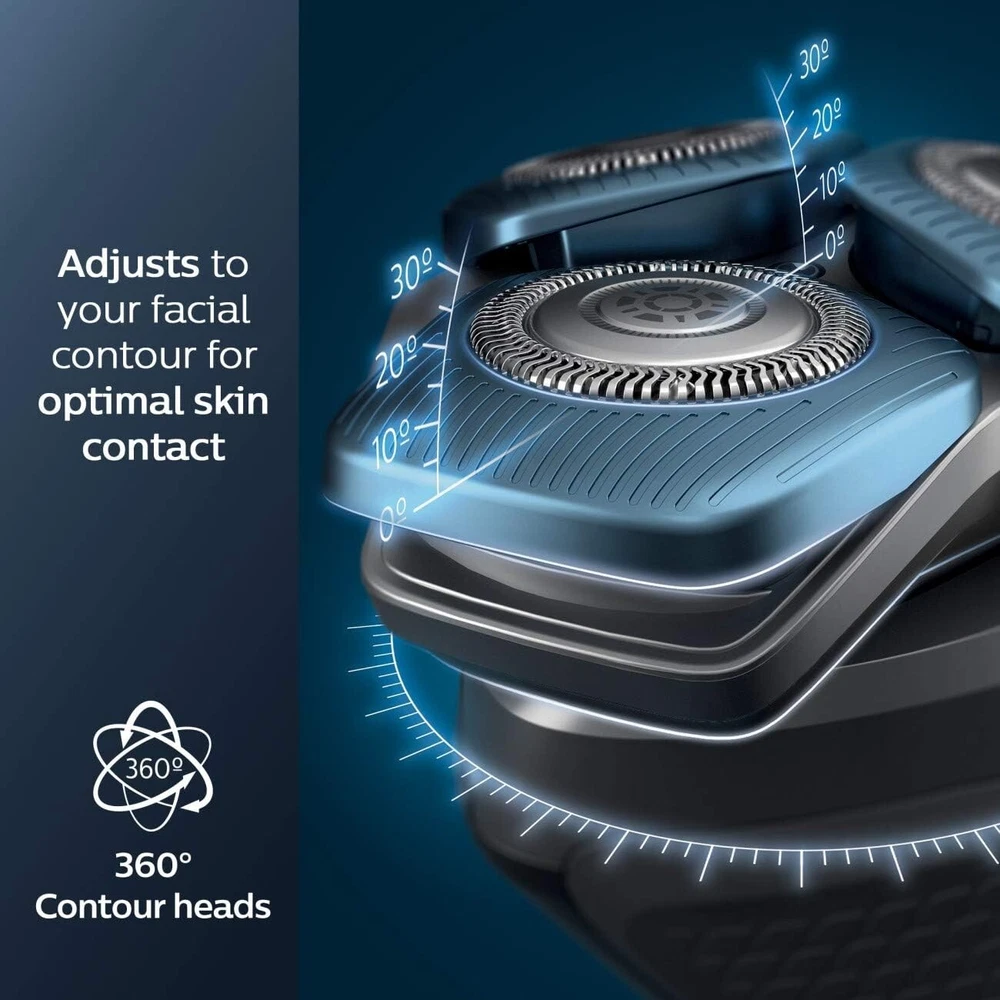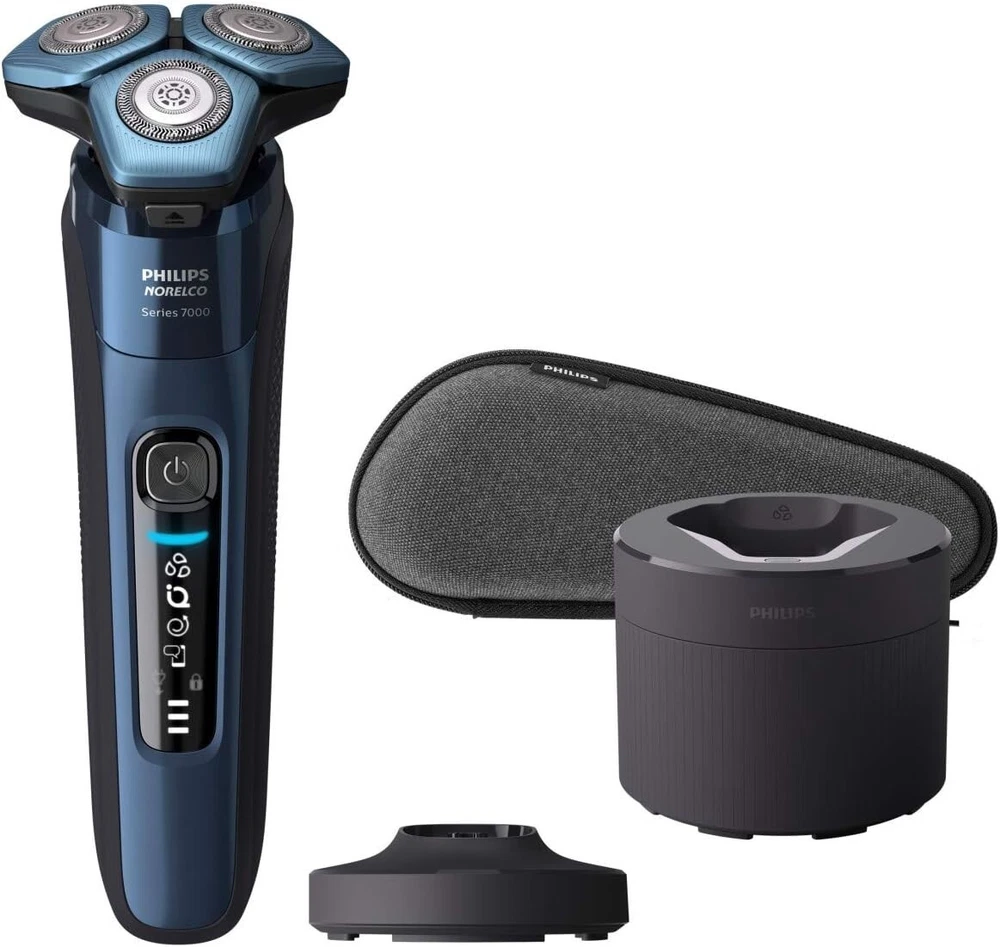 About this item Philips Norelco Shaver 7700 delivers a smooth shave while reducing skin irritation. Only Philips has ComfortGlide rings, a special coating to protect your face from irritation. Shaving heads are surrounded with ComfortGlide rings, a special protective coating with skin gliding properties, to shield your face from irritation. With up to 90,000 cutting actions per minute, the SkinProtect blades deliver a close shave with fewer passes for more comfortable skin vs. Philips Norelco Shaver Series 3000 Powerful cleaning pod thoroughly cleans and lubricates your shaver in just 1 minute, keeping it performing at its best for longer With a powerful Li-ion battery, get up to 60 minutes of cordless shaving - about 20 shaves - on a 1-hour charge. 5-minute quick charge for one shave Includes: Electric shaver, travel case, charging stand, Quick Clean Pod, Philips Norelco Quick Clean Pod cartridge 160mL (5.41 fl oz), cleaning brush and power cord