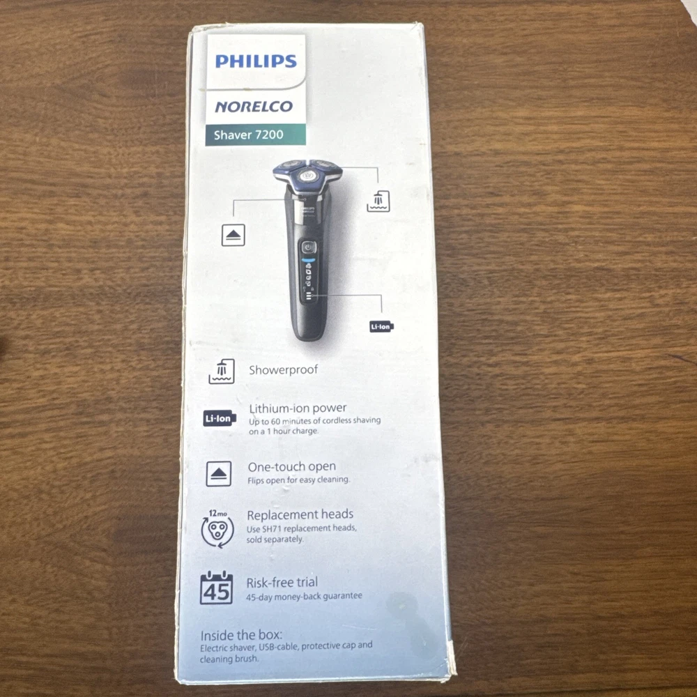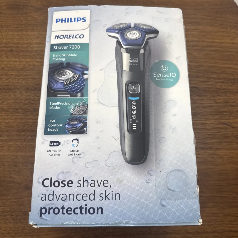 Model: 7200 Power Source: Battery Head Type: 3 Head Rotary gtin13: 075020104373 Color: Gray Brand: Philips Norelco Department: Men Body Area: Back, Body, Chest, Face, Neck, Pubic Type: Shaver Motor Type: Rotary Number of Heads: 3 UPC: 075020104373 Features: Adjustable Speed, Cordless, Hair Trimmer Option, LED Display, Low Battery Indicator, Pivoting Head, Quick Charging Time, Rechargeable, Travel Case, Travel Size, Waterproof, Wet/Dry MPN: S7887/82