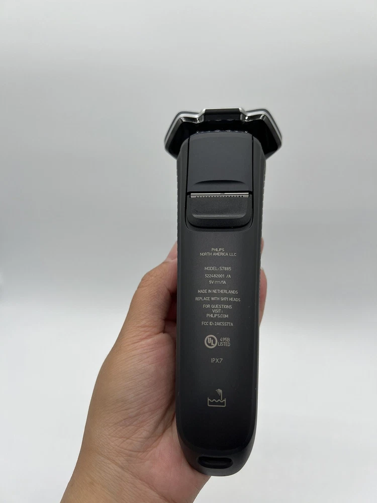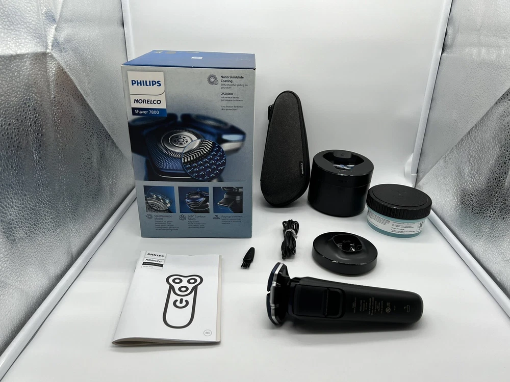 Philips Norelco Shaver 7800 Rechargeable Wet & Dry Electric Shaver S7885 (R2(24) It’s brand new, open box, damaged box! Made of up to 250,000 micro-tech beads per square cm, Nano SkinGlide coating improves gliding on skin by up to 30%*, to minimize irritation. With up to 90,000 cutting actions per minute, the SteelPrecision blades shave close, cutting more hair per stroke*. The 45 high-performance blades are self-sharpening and made in Europe. The intelligent facial-hair sensor reads hair density 250 times per second. The technology dynamically auto-adapts cutting power for an effortless and gentle shave. Motion-sensing technology tracks how you shave and guides you to an improved shaving technique with fewer passes. Fully flexible heads turn 360° to follow your facial contours. Experience optimal skin contact for a thorough and comfortable shave. Charge your shaver fully in just 1 hour with the powerful and energy efficient lithium-ion battery. In a hurry? Plug in your shaver for 5 minutes and get enough power for 1 full shave. (wall adapter NOT included) Adapt your shaving routine to your needs. With Wet & Dry, you can go for a comfortable dry shave or a refreshing wet shave. You can shave with gel or foam even under the shower. Complete your look using the shaver's pop-up precision trimmer. Integrated into the shaver's body, it's the perfect way to maintain a mustache and trim sideburns.