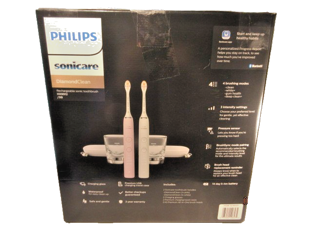 Philips Sonicare HX9912/99 DiamondClean Rechargeable Electric Toothbrush 2 Pack Unit Includes Philips Sonicare DiamondClean Power Toothbrush Set of 2 handles, 2 charging glasses, 2 charging travel cases, (2) A3 Premiuim All-inOne brush heads. Features 4 brushing modes, 3 intensity settings, pressure sensor, BrushSync mode pairing, and brush head replacement reminder.