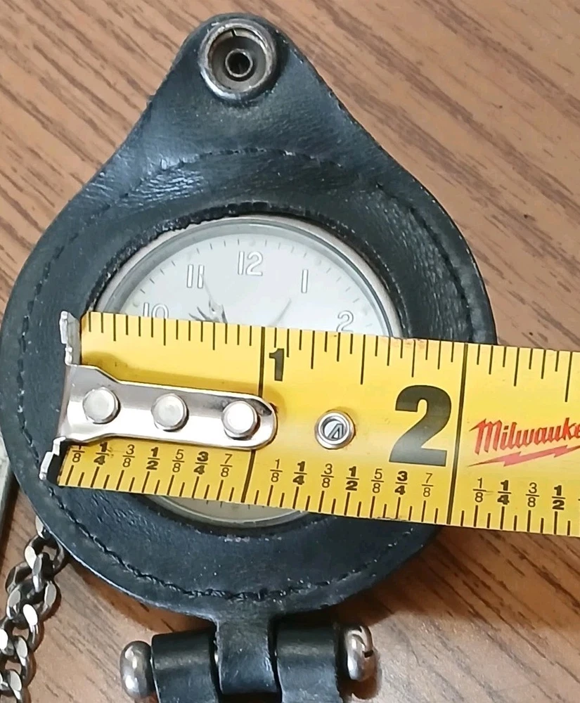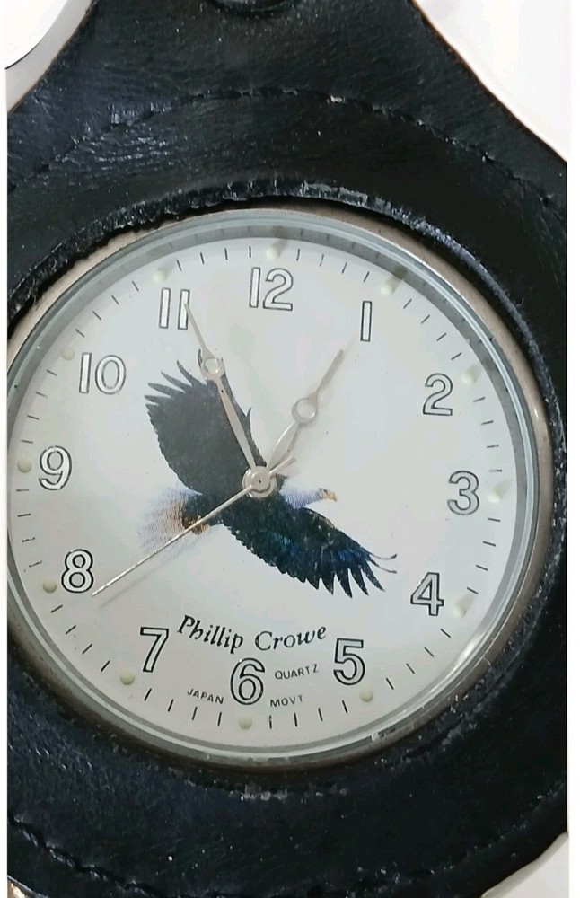 🦅 Classic Eagle Pocket Watch w/ Leather Case & Chain This Phillip Crowe pocket watch features a bold eagle dial design with a quartz movement housed in a leather protective case , complete with a matching chain and clip . A great piece for collectors or anyone who appreciates classic wildlife-themed timepieces. The watch is pre-owned and shows wear consistent with age and use, primarily on the leather case (surface wear and natural aging). The watch has not been tested and will likely need a new battery. No further testing has been performed. You will receive the exact item shown in the photos. ✔ Condition • Pre-owned with minor wear • Leather case shows surface wear and aging • Watch functionality untested (battery needed) • No cracks noted to the crystal • Chain and clasp included ✔ Measurements (approximate) • Watch face: 1⅝" x 1⅝" • Watch with leather case: 2½" across • Length (open): 9" • Length (closed): 6¼" • Chain length: 12" (about **13½" including clip) 📦 Ships quickly and carefully by the next business day. --- 🗝 Pocket Watch • Eagle Watch • Wildlife Timepiece • Leather Pocket Watch • Quartz Watch • Collector Watch • Vintage Style Watch • Gift Idea --- 🔎 #PocketWatch #PhillipCrowe #EagleWatch #WatchCollector #QuartzWatch #LeatherCase #MensAccessorie