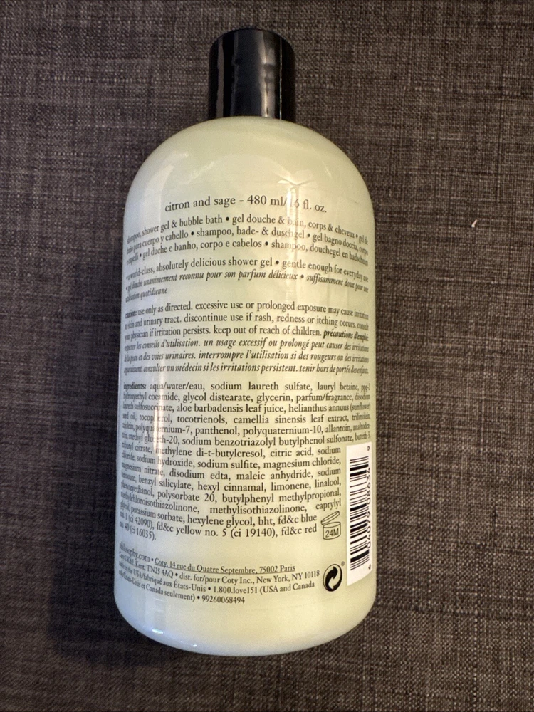 Philosophy Citron and Sage 3 in 1 Shampoo Shower Gel Bubble Bath 16 oz Sealed.
