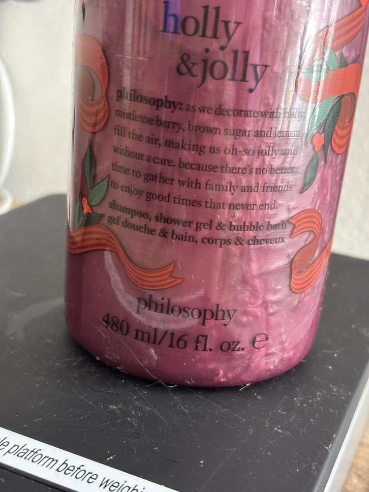 Scent: Holly & Jolly Ingredients: Sugar Skin Type: All Skin Types Volume: 16 fl oz Product Line: Holiday 2021 UPC: 3616302514625 Color: Berry Features: 3 in 1 Formulation: Gel, Liquid MPN: does not apply Body Area: Body Size: 16 ounce Type: Shower Gel gtin13: 3616302514625 Brand: Philosophy