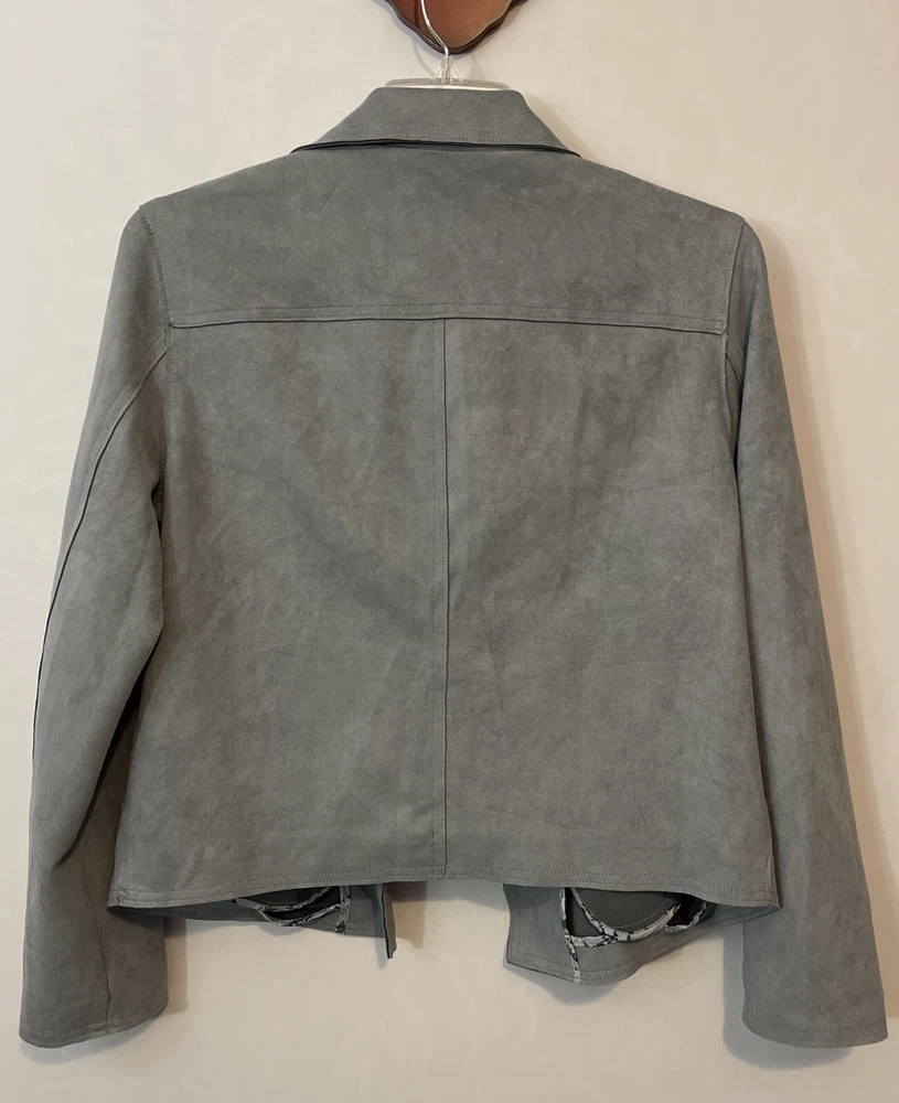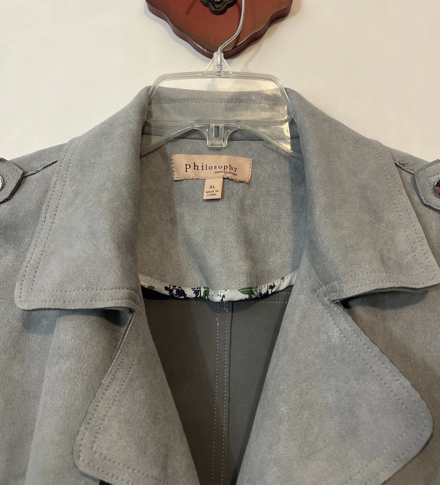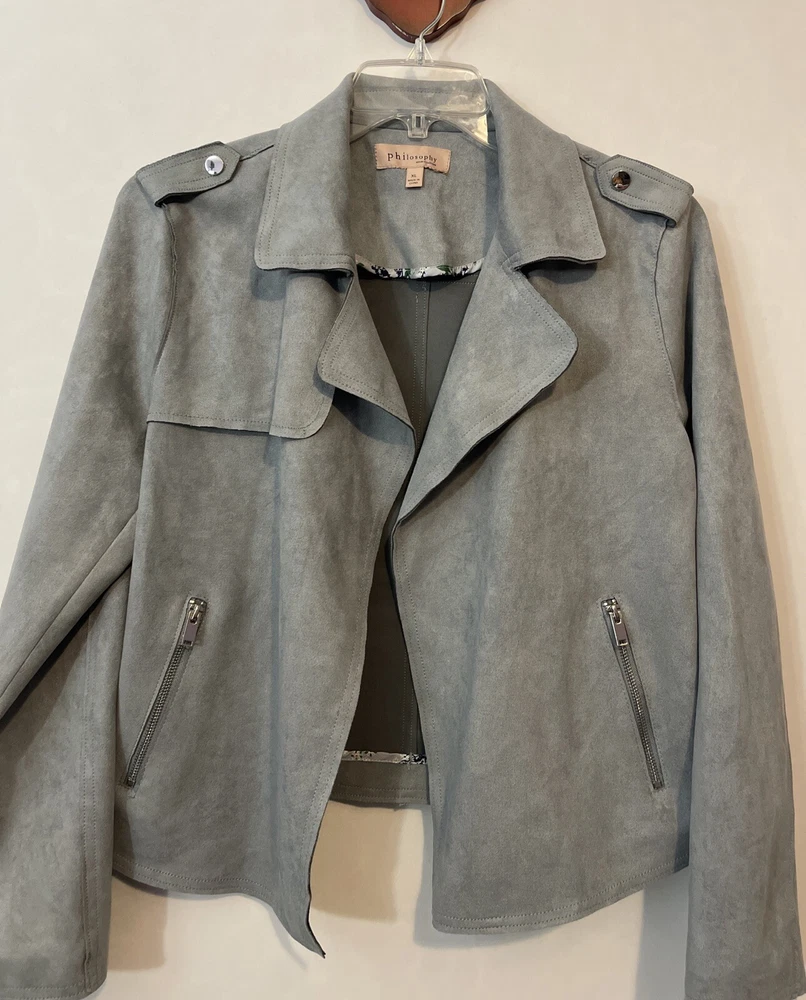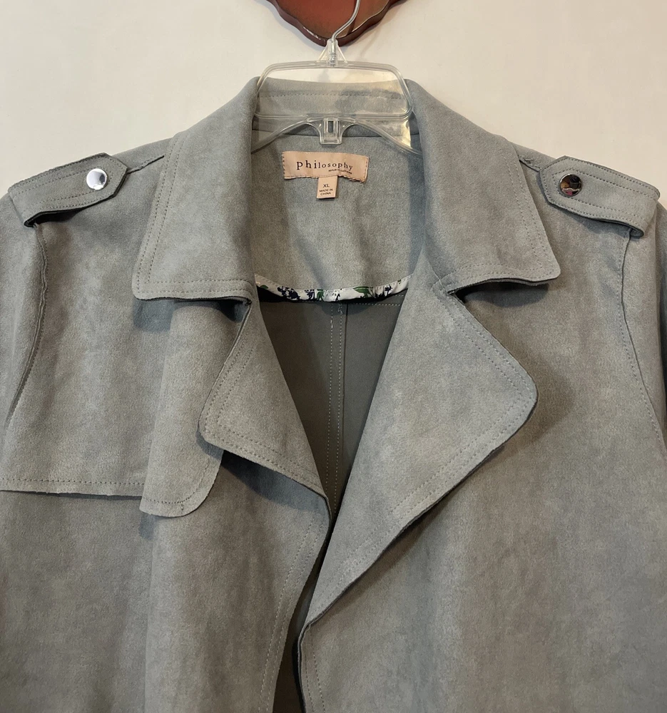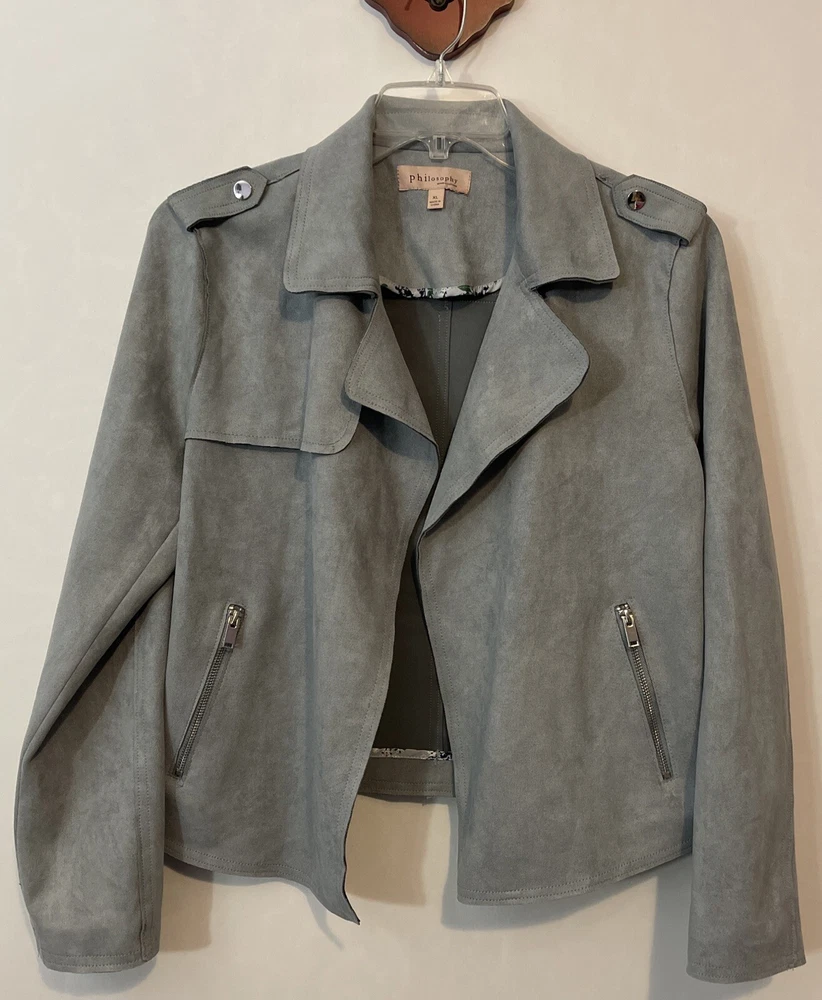 Elevate your wardrobe with this stunning Philosophy jacket! Crafted from luxurious velour style fabric, this gray jacket features an open-front design with a collared neckline and pleated accents. The long sleeves and zipped pockets make it perfect for both casual and business occasions, while the stretch and breathable features ensure comfort all year long. This designer jacket is available in size XL and is a must-have addition to any fashion-forward woman's collection. With its solid pattern and buckle and zipper accents, this jacket exudes sophistication and style. Add a touch of elegance to your outfit and make a statement with this Philosophy jacket! Length: 22 inches. Chest: 23 inches across laying flat. Material: polyester spandex blend.