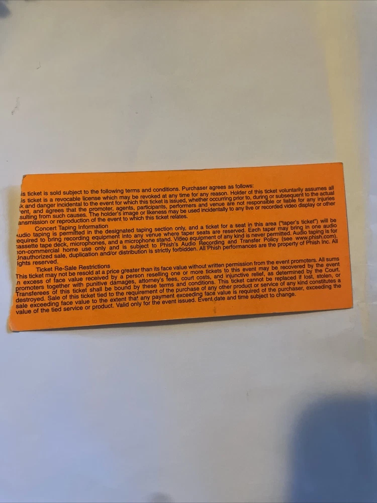 Experience the magic of live music with this ticket stub from Phish's Meadows Music Theatre summer tour of 2000. This rare piece of entertainment memorabilia features the iconic rock band's name prominently, along with the date and location of the show. It's a must-have for any Phish fan or collector of music memorabilia. Whether you're a seasoned collector or just starting out, this ticket stub is a valuable addition to your collection. It's a tangible reminder of the band's live performances and the unforgettable experiences that came with them. Don't miss out on owning a piece of Phish history with this Meadows Music Theatre ticket stub.