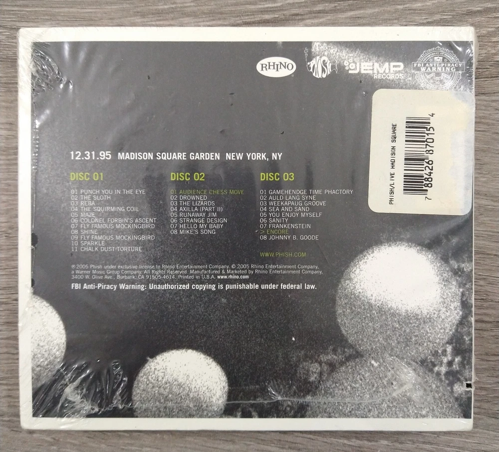 Phish New Years Eve 1995 @ MADISON SQUARE GARDEN CD - SEALED/NOTCHED COPY πππΏ New Old Stock Copy Sealed Spine is Notched which could mean two things... it was either a promotional copy, or an unsold copy that was returned to the label for retailer credit.