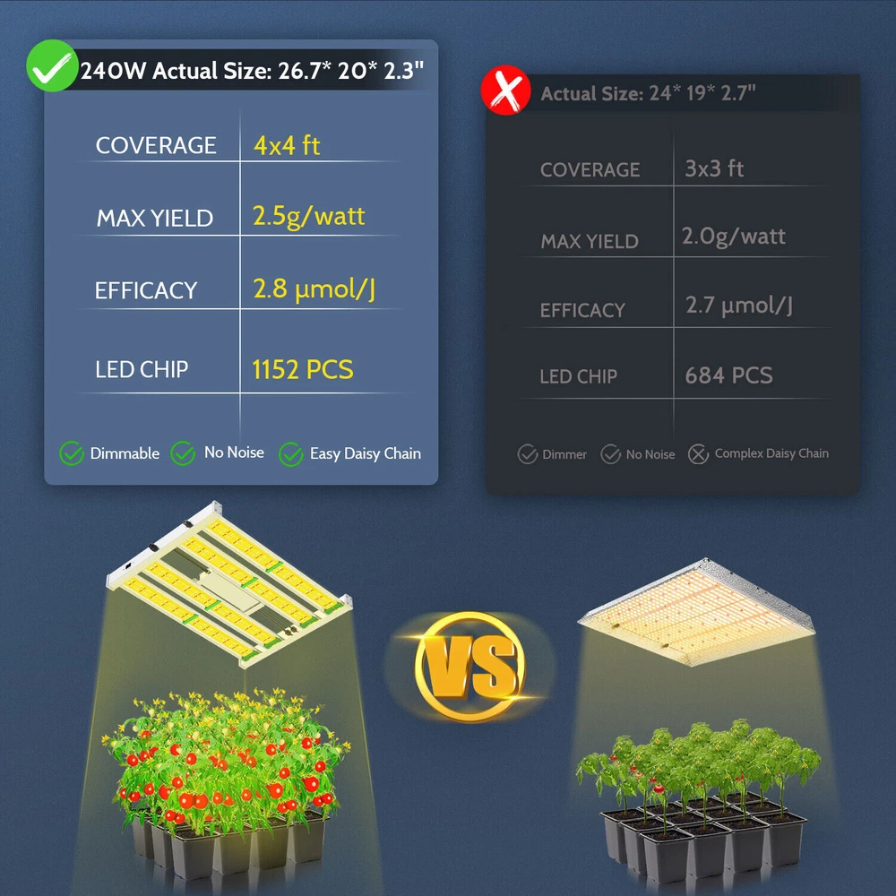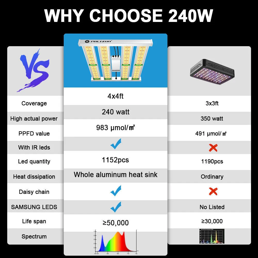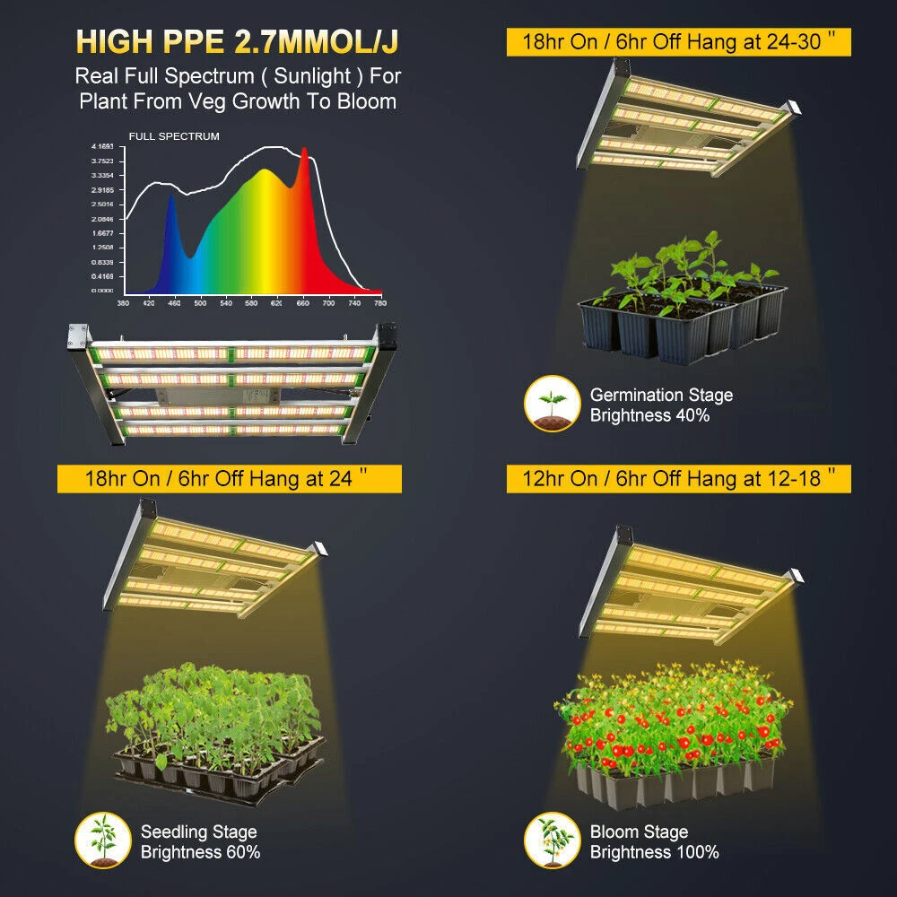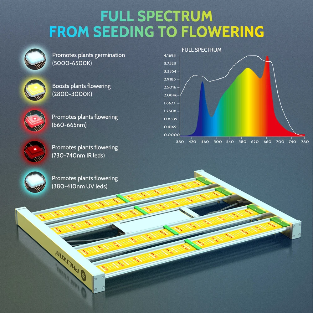 Dimmable knob can adjust the light intensity, to meet different lighting requirement from seeding, veg to flowering and fruiting. Protective glue on lamp surface around LEDs, makes the light water proof while retains LED original high lighting emission. The water proof feature aids in keeping the lady bugs out of the light fixture. Phlizon 2000W Pro LED Commercial Grow Light Full Spectrum for Indoor 4x4ft Tent Premium Quality Low Maintenance Dimmable knob can adjust the light intensity, to meet different lighting requirement from seeding, veg to flowering and fruiting. Protective glue on lamp surface around LEDs, makes the light water proof while retains LED original high lighting emission. The water proof feature aids in keeping the lady bugs out of the light fixture. About this item EXTREMELY LARGE GROW AREA- Compared with other grow light, the outstanding feature of this lamp is that it has a larger irradiation area. This is not only due to SMD lamp beads, but also because of its special appearance design. It contains 1152 pcs led beads and itself has a large area . The all-aluminum alloy design also makes it lighter and easy to use. LESS ENERGY, MORE YIELDS - Built with high performance LEDs and reliable driver, Phlizon LED grow light offers high energy efficiency at 2.7 umol/J with power consumption of only 240w , achieves 200% yield but 50% less energy cost than Blurple/cob/HID/fluorescence. DIMMABLE FULL SPECTRUM DESIGN- The intensity of light can be adjusted according to the needs (plants germination, clones, vegetative flowering and fruiting). dedicated made to shorten growth cycles, improve color, shape and taste of indoor plants. The leds are all new technology SMD leds, It contains 720pcs SMD led beads , including 704pcs 3000K leds , 256pcs 6000K leds,176pcs 660nm red led,16pcs IR leds.Perfect for 4 x 4 ft vegetative stage and 3 x 3 ft flowering stage. FANLESS Design and Waterproof FUNCTIONS - Unique designed 4-LED bars provide more even canopy coverage, especially to the outer edges cultivation areas ,No fans no noise and waterproof function. Otherwise, the plant grow light uses advanced waterproof power supply which is installed outside of the light and it is easy to be replaced. The latest SMD LEDs produce much less heat, plus sturdy aluminum bar adopted for fast heat sink. The light runs at a lower temperature than HPS. No fan, no noise. You can enjoy a quiet growing environment without worrying your plant being burnt. BEST SERVICE- We are a professional LED light manufacturer with strong R&D team and many light tester. 3 years warranty plus 30 days money back guarantee. If you have any problems, please feel free to contact us. We will provide you with completely satisfing reply. Features Shorten growth cycles Improve color, shape and taste Plant growth is not affected by the weather Custom light recipe to fit your crop and situation Best for all plants all stages growing Increase yield & crop quality Low maintenance costs Easy to mount and connect SPECIFICATIONS OF Full Spectrum LED Grow Light Bar: Model No. PRO-2000W Power Consumption 240W±5% Input Voltage AC85-265V Working Frequency 50~60Hz Spectrum Full Spectrum Light Source Samsung 281b +660nm Coverage 4X4FT HPS Replacement 1500W Item Weight 5KG Item Size 58*44*5.4cm Light Distributions 120degree Efficacy 2.7umol/ J PPF 983 umol/m²s Working Environment -20~45°C, 45%~95%RH material Aluminum OEM / ODM Welcome Warranty 2 Years Make Planting Easier Phlizon provides you with the premium hydroponics equipment and services. It is our commitment to be the best indoor gardening and hydroponic store that you can trust. Professional indoor gardening and hydroponic manufacturer High quality control standard Get the Best Results with Phlizon LED Grow Light 2020 Latest Design Phlizon Pro-2000W LED breeding lamps are with improved SMD2835 LEDs, flexible dimming and advanced folding, ideal full spectrum and amazing heat dissipation, external power supply and dimmer, absolute price-performance ratio. Real 240 watts of performance, ideal for all types of houseplant cultivation, especially medicinal plants, herbs, even violets, tomatoes, orchids, succulents, peppers. Philizon Pro-2000W LED breeding light consists of full spectrum white and red and IR and supplies plants in all stages from vegetables to flowering with everything they need in natural sunlight and makes their plants healthier and happier. Max coverage area: 4*4ft Power Consumption: 240Watts Voltage: 100-277V Energy Efficiency: 2.7umol/J Package include:1x LED grow light; 2x hangers, 120V uk power cord Bring in the Sunlight to Keep Your Plants Healthy and Thriving. Why we choose led grow light? As an artificial supplemental light, led plant lamp’s light can be enhanced anytime in a whole day, what effectively extend the lighting time by plants. 🌿Whether it is sunny, cloudy or rainy, led plant lamp can reasonably and effectively extend and scientifically control the light needed for plants. 🌿In the greenhouse or plant laboratory, plant grow light can completely replace natural light, to ensure plant healthy growth and promote faster and better growth. 🌿Compare with HPS/MH/HID/CFL lamp, LED growing light can improve plant efficiency and save electricity! High Efficient SMD LEDs With today latest SMD LEDs, PHLIZON grow light series reaches high energy efficiency - a great PPE of 2.7umol/J at only 240W actual power; doubles the yielding while using only half the energy than red/blue light. Customized Dimmer Knob A Dimmer Knob makes it easy to adjust brightness to meet different stages of plant growth. More user-friendly and Energy saving. Water Resistant Coating The protective glue on the lamp surface around LEDs makes the light anti-moisture; suitable for damp growing environment, yet it retains the original high lighting emission of LEDs. Die-Cast Aluminum for Fast Heat Sink Thick and sturdy aluminum bar adopted for fast heat sink. Maintain the light to be cool