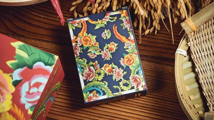 Please note: We only sell genuine playing cards from bonafide manufacturers. Features: Premium paper with embossed gold foil tuck case. Blue version with sun-sensitive ink, turns blue under sunlight. Printed by Bacon Playing Card Company(BPCC) in China. The Phoenix and Peony pattern originated in 1950s China and was designed by the Design Department of Shanghai East China Textile Bureau. This design style features bold color combinations of red and green. At that time, Chinese fashion was dominated by black and other dark colors, so this innovative and vibrant design quickly swept across the country. The patterns of Phoenix and Peony are meticulously designed by professional artists, with redesigned suits and numbers. The court cards feature a vintage European style, seamlessly combined with the peony and phoenix motifs, showcasing a fusion of different cultures. The card backs have an unconventional all-white border design, and when fanned in different directions, they create various visual effects, enhancing your cardistry moves. In addition to the standard color combinations of red and green, there is also a special edition in blue. It incorporates the latest development of BPCC's photochromic ink technology. The indoor card back has a white background, but when exposed to sunlight or UV flashlight, an elegant blue color will appear on the card back. The card box is made of high-quality specialty paper. The front text is adorned with laser gold foil stamping, which is different from regular foil stamping. It reflects more vibrant colors when exposed to light at different angles. The front and back designs of the card box are outlined using the same foil stamping technique, giving the entire deck of cards a luxurious and elegant feel. ____________________________________________________________________________________________ Are you ready to elevate your poker game with original playing cards? Visit our store today to browse our selection of authentic decks and start playing like a pro. Remember, when it comes to poker and other card games, we only sell original cards from genuine sources. Experience the difference for yourself and take your gameplay to new heights with premium quality playing cards.
