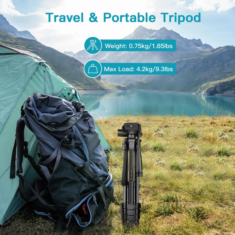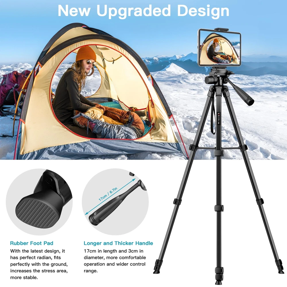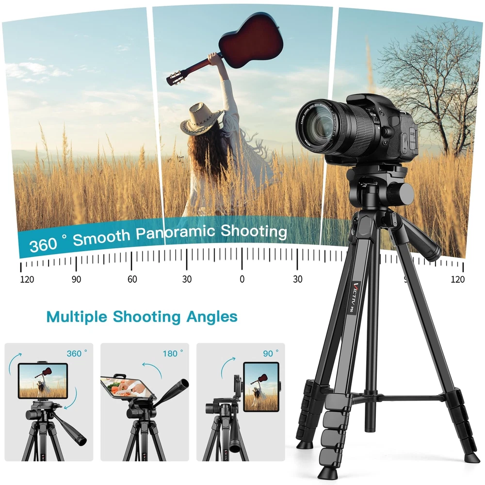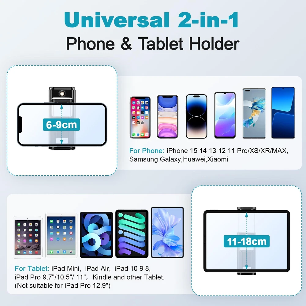 iPad Tripod 【 Phone Tripod with Universal 2-in-1 Tablet Holder】phone and tablet tripod comes with a 2-in-1 clip, can carry both cell phone (landscape/vertical) and tablet. Compatible with iPad, iPad Air, iPad Pro 10.2"/10.9"/11"/12.9", iPad mini, and many other tablets. For smartphones like iPhone15 14 13 12 11 Pro/XS/XR, Samsung, Xiaomi, Huawei, etc 【Multi-functional Tripod Kit & 3-Way Pan Head】Versatile camera tripod comes with Standard 1/4" screw mount, performs well with a wide range of devices, compatible with small cameras/DSLR/Gopro/webcams/ring light. Stable and smooth 3-way pan head can freely adjustable angles for 360° panoramic shooting, 180°up & down shooting, and 90°vertical portrait , which can satisfy all the needs of vertical, horizontal, and overhead photography, etc 【Wireless Remote Shutter】Phone tripod stand is equipped with a wireless remote, easily connect your phone (iOS and Android), tablet, camera.It allows you to conveniently capture photos and videos from a distance of up to 33ft/10m. No need to touch, you can easily realize photo shooting, video shooting 【Stable Tripod Adjustable Height】Tripod stand easily extends the tripod height (from 16.9 inches to 68 inches) by adjusting the quick-release leg locks, perfect for various photography heights. Non-slip rubber feet provides strong stability, withstand up to 9.3 pounds of pressure. It provides reliable support for various photography needs, selfies, camera photography, live streaming, vlogging, pursuing fitness activities or practicing dance 【Portable Travel Tripod】 Tripod stand comes with a convenient storage bag, lightweight and compact, weights 1.65lbs, folded size is 15.7 inches, and it's easy to transport and store