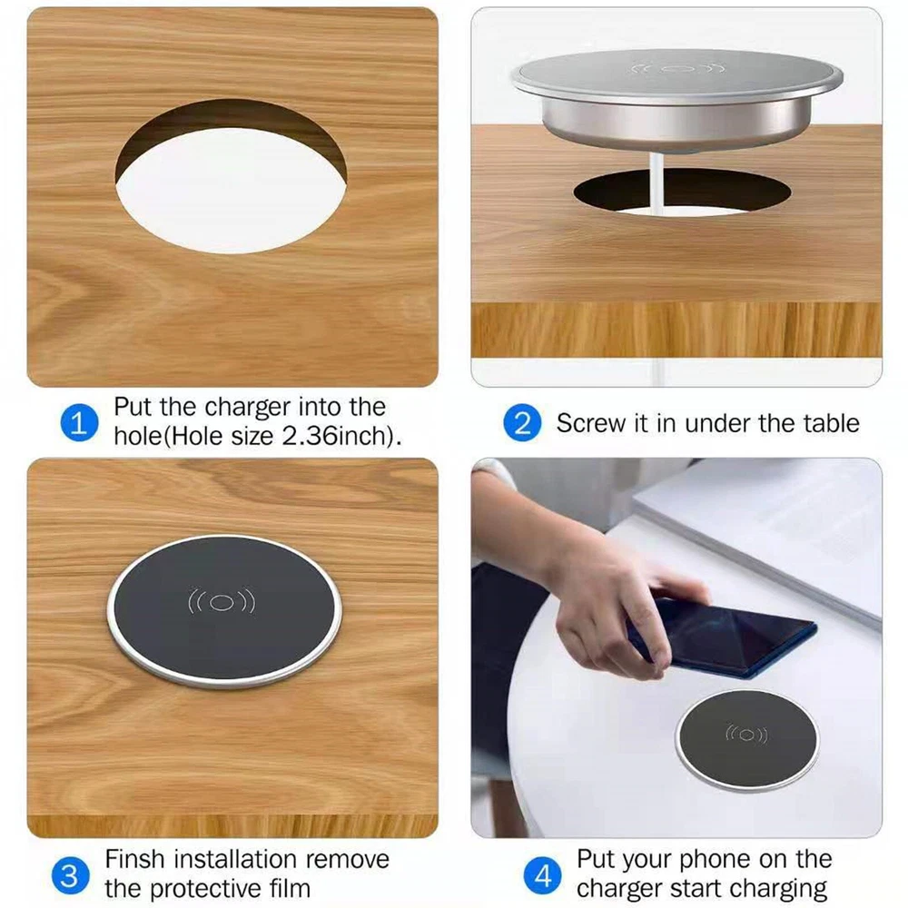 NEW-00023 Phone Wireless Fast Charger Furniture Table Desktop Embedded For HUAWEI Samsung PRODUCT DESCRIPTION Built in Desktop 15W Wireless Charger Desktop For Furniture Embedded Fast Wireless Charger Case For Samsung Features: 1. The base metal is made of aluminum alloy material, which has good heat dissipation effect. 2. It can automatically recognize the foreign objects and charge your device at a fat speed. 3. Built-in thermal resistance, which can effectively control the current and low temperature charging. 4. Perfectly designed for installation in desk conference table counter, wireless fast charger makes your phone powerful anytime. 5. When it finishes the charging, it will automatically cut off the electricity to protect your device battery and let it has a long service life. 6. Exclusive Multifunctional Intelligent Protect Technology provides temperature control, surge protection, short-circuit prevention, and more. 7.It is compatible with for iPhone/for Samsung Galaxy Specification: Material: Aluminum Alloy Diameter: 75mm/2.9inch Thickness: 12mm/0.4inch Input: 5V/1A 9V1.67A Output: 5V/1A 9V/1.2A Power: 5W 7.5W 15W Charging Distance: 8mm max/0.31in Compatible Devices: For Apple: for iPhone8, for iPhone 8Plus, for iPhone X, for iPhone Xs, for iPhone Xs Max, for iPhone XR. For Samsung: for Galaxy S7, for Galaxy S7 Edge, for Galaxy S8, for Galaxy S8+, for Galaxy Note 9, for Galaxy Note 8, for Galaxy S9, for Galaxy S9+ etc. For HUAWEI: for Mate 20pro, for Mate 30pro, P40/P40Pro. For Google: For Google pixel 3/3XL, For Google pixel 3a/3aXL For LG: G7/G7+, G6/G6+, V30/V30+ Package Included: 1 x Wireless Charger 1 x USB Cable(Not included power adapter) 1 Set screw kit Shipping Contact Us Our products have been sent to the US warehouse. All items will be shipped via WINIT CORPORATION. In 2-5 working days, you will receive your items. Thank you and have a nice day. If you have any question about us or items, please contact us, we will reply it as soon as possible. Shipping Our products have been sent to the US warehouse. All items will be shipped via WINIT CORPORATION. In 2-5 working days, you will receive your items. Thank you and have a nice day. Contact Us If you have any question about us or items, please contact us, we will reply it as soon as possible. PaymentShippingReturn policyAbout usContact us Copyright © - Tongtool All rights reserved | Design:Tongtool