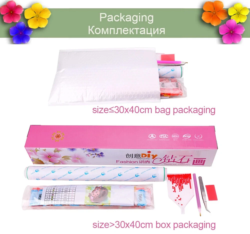 Welcome to HOMFUN Store name : HOMFUN Store (Click here to visit HOMFUN Store) 1.Fast Delivery : We are factory-direct sale, we have over 300 workers, we will ship out your orders within 1-3 days. We will choose the best shipping method to ship out your parcels. We will return you money if you cannot receive your parcel within 75 days! 2.High-quality Services : Drop your diamonds? Spoiled your canvas? No worries! We will replace your kits for free! If you are unhappy for any reason contact us by i message, we will work our hardest to make you happy. 3.Welcome Dropshipping : If you want to sell our products. just contact us, we have a VIP- Salesman to take care of all your orders! You just sell, we will responsible for all your after-sale service! All your tools, packaging boxes, canvases, logos, can be customized to create your own unique diamond painting products! 4.size :The size of all products in the store, All are the size of the real diamond sticking area! It's not canvas size! 5.Diamond Material : Our diamond material is resin material that has been approved for environmental protection! Not made of acrylic material! resin material has better quality and is more shiny! We offer you the most favorable price with very expensive materials because we are a factory! What is "AB Diamond" The original ordinary diamond cut surface laser process, Presents shiny colors.In the diamond painitng,AB diamonds are used to embelish and make the diamond painting more shiny。 AB diamonds have 1-5 colors in each painting!!! Color Quantity: 20-45 Colors AB Color Quantity: 1-5Colors 100% Money Back Guarantee. Fast Delivery Available. 99.3% Reviewers Recommends This Product. Make your own diamond picture! Any photo can be made! Diamonds covers full part of picture, with 30% more quantity of diamonds, absolute enough. HOW TO ORDER: 1. Upload your image and select the painting size you want. 2. Click "Add to Cart" 3. Enter billing information. Done! Need help? Please contact Customer service Pasting Area: Full Coverage Diamond Shape: Square And Round Kit Includes: -Fabric printed with design chart -Colorful diamonds -Point Drill Pen -Drill Tray, Wax ----------------------------------------------------------------------------------------------------------------------------------------- About photo custom Please provide pictures to us, choose your favorite size,then we will make for you If you need a layout before payment ,please contract us,we will send to you --------------------------------------------------------------------------------------------------------------- About size The larger the size, the clearer the picture -------------------------------------------------------------------------------------------------------------- How to upload photo --------------------------------------------------------------------------------------------------------------- Full Square / Round Drill 5D DIY Diamond Painting All Can Be Customized 1.The painting canvas, the rhinestones and all tools will be packed into a box. 2.The color of box is different. It depends on the size of the painting. 3.The box is strong enough to protect the product, but the box may get little damage during transport. The tools include dotting pen, tweezers, dotting cemeent, small bags, plate. 1. Refer to the comparison table on the canvas to identify each diamond number and the corresponding printed number on the canvas. 2. Insert the round end of the dotting pen into the dotting cement (push hard to keep the cement in place). 3. Use the round end of the pen to stick a diamond and slightly press down to remove any extra cement. 4. Tear apart the partial film and place the diamond on the canvas according to the corresponding number. 5. If you stick a diamond to a wrong area on the painting, remove the diamond with tweezers. 6. After finishing, slightly press down the diamonds with your hand or a book to ensure that the diamonds are firmly attached. PS: There is a video to show you how to complete this painting at the top of this page. And it can be seen only on computers. And if you still worry about how to complete, you can buy a small painting to practice. Diamond Supplement Service We will resend you any diamonds that you may lose. Some Other Service 1. If you have any questions, please feel free to contact us. And we will reply in 24 hours except weekends. 2. If any problems comes to you, please don't worry. You can contact us first. We promise we will try everything possible to help you. 3. Please pay attention to the time difference between us. We work in China. The Time Table of our Work time. Time Zone Working Time Beijing Time 08:30 to 17:30 Moscow Time 03:30 to 12:30 US Pacific Time 17:30 to 02:30 Dutch Time 02:30 to 11:30 About Shipping Country Usually arrive time Russian Federation 15 ~ 23 days Netherlands 12 ~ 15 days United States 14 ~ 19 days Spain 13 ~ 17 days France 13 ~ 17 days United Kingdom 10 ~ 13 days Ukraine 16 ~ 21 days Others 15 ~ 30 days 1.We ship by AliExpress Standard Shipping, AliExpress Premium Shipping, China Post Registered Air Mail, SPSR, Pony Express and DHL. 2.Friends from Russian Federation need to provide the Passport Information when send by AliExpress Premium Shipping, SPSR and Pony Express. (The system will remind you automatically.) 3.If you don't receive your parcel after 30 days, we can refund if you want. Is the rhinestones round or square? Full Square/Round Drill DIY Diamond Painting All can be customized Is the diamond painting full or partial? Is Full Square/Round Drill DIY Diamond Painting Is the rhinestones enough? The rhinestones is enough. We put 30% extra diamonds in every bags of diamonds. And we provide Diamond Supplement Service. About our diamond colors. The bigger the size, the more color. What is the size of the painting? All size in our store usually means Picture Size . Note Our diamond painting are semi-finished, do not include frame. We will provide the diamond embroidery tools