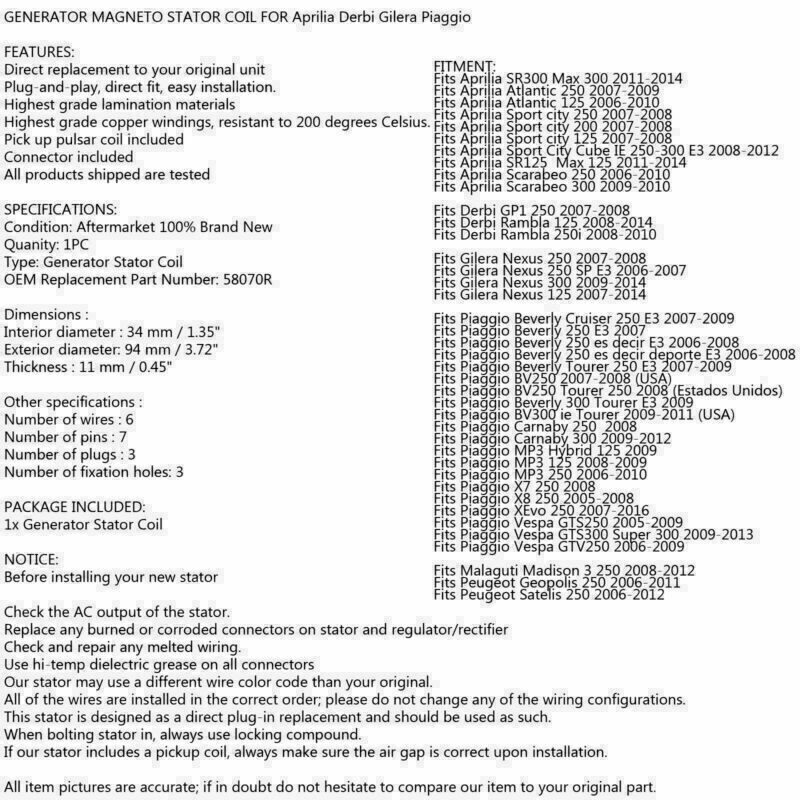 🔥Hot Sale Items On Sale Regulator Magneto Stator Gasket Kit For Kawasaki ZX-9R Ninja ZX 900 2000-2003 V1 88.39 USD Free shipping Stator Regulator Rectifier Gasket Set For Honda VFR800 VFR 800 RC46 2002-2013 V1 109.52 USD 121.69 USD Free shipping 10% off Magneto Stator + Voltage Rectifier +Gasket For Suzuki DR650SE DR650 Se 1996-2019 69.52 USD Free shipping Magneto Stator Pick Up Coil Fits Thruxton \Speedmaster America 900 02-17 T9 65.08 USD Free shipping STATOR BASE FOR KAWASAKI KX 125 KX125M 03-05 GENERATOR 21003-1394 21003-0021 V1 49.63 USD Free shipping Regulator Magneto Stator Coil Gasket Kit For Suzuki GSX GS 450 E S L 80-1988 V1 42.59 USD 47.32 USD Free shipping 10% off Regulator Magneto Stator Gasket Kit For Suzuki SV 650 / A 03-12 SV 650 S 03-2007 79.55 USD 88.39 USD Free shipping 10% off Magneto Stator Generator Flywheel Rotor For Yamaha FZ1 2006-15 2SH-81450-00-00 V 58.57 USD 65.08 USD Free shipping 10% off Magneto Stator+Voltage Rectifier+Gasket For Kawasaki Ninja ZX9R ZX-9R 1998 99 V1 63.63 USD Free shipping Regulator Magneto Stator Coil Gasket Kit For Honda CRF 250 X ME11 2004 - 2019 V1 89.54 USD 99.49 USD Free shipping 10% off Generator Stator Regulator & Gasket For Kawasaki GPz KZ1100 LTD Spectre 81-83 V1 62.57 USD 69.52 USD Free shipping 10% off Magneto Stator+Voltage Rectifier+Gasket For Kawasaki 17-21 Z650 Ninja/Versys 650 75.63 USD Free shipping SAFE & SECURE SHOPPING 100% SATISFACTION GUARANTEED FAST SHIPPING Store Categories Store Categories Other 🔥US Hot Sale Fairings🏍️ CN Fairing Kit US HOT SALE NEW ARRIVAL Magneto Generator Stator Coil 58070R For Piaggio MP3 125 250 Hybrid 125 06-10 V1 Product Description UNIVERSAL GENERATOR MAGNETO STATOR COIL FOR APRILIA DERBI GILERA PIAGGIO FEATURES: Direct replacement to your original unit Plug-and-play, direct fit, easy installation. Highest grade lamination materials Highest grade copper windings, resistant to 200 degrees Celsius. Pick up pulsar coil included Connector included All products shipped are tested SPECIFICATIONS: Condition: Aftermarket 100% Brand New Quanity: 1PC Type: Generator Stator Coil OEM Replacement Part Number: 58070R Dimensions : Interior diameter : 34 mm / 1.35" Exterior diameter : 94 mm / 3.72" Thickness : 11 mm / 0.45" Other specifications : Number of wires : 6 Number of pins : 7 Number of plugs : 3 Number of fixation holes: 3 FITMENT: Fits Aprilia SR300 Max 300 2011-2014 Fits Aprilia Atlantic 250 2007-2009 Fits Aprilia Atlantic 125 2006-2010 Fits Aprilia Sport city 250 2007-2008 Fits Aprilia Sport city 200 2007-2008 Fits Aprilia Sport city 125 2007-2008 Fits Aprilia Sport City Cube IE 250-300 E3 2008-2012 Fits Aprilia SR125 Max 125 2011-2014 Fits Aprilia Scarabeo 250 2006-2010 Fits Aprilia Scarabeo 300 2009-2010 Fits Derbi GP1 250 2007-2008 Fits Derbi Rambla 125 2008-2014 Fits Derbi Rambla 250i 2008-2010 Fits Gilera Nexus 250 2007-2008 Fits Gilera Nexus 250 SP E3 2006-2007 Fits Gilera Nexus 300 2009-2014 Fits Gilera Nexus 125 2007-2014 Fits Piaggio Beverly Cruiser 250 E3 2007-2009 Fits Piaggio Beverly 250 E3 2007 Fits Piaggio Beverly 250 es decir E3 2006-2008 Fits Piaggio Beverly 250 es decir deporte E3 2006-2008 Fits Piaggio Beverly Tourer 250 E3 2007-2009 Fits Piaggio BV250 2007-2008 (USA) Fits Piaggio BV250 Tourer 250 2008 (Estados Unidos) Fits Piaggio Beverly 300 Tourer E3 2009 Fits Piaggio BV300 ie Tourer 2009-2011 (USA) Fits Piaggio Carnaby 250 2008 Fits Piaggio Carnaby 300 2009-2012 Fits Piaggio MP3 Hybrid 125 2009 Fits Piaggio MP3 125 2008-2009 Fits Piaggio MP3 250 2006-2010 Fits Piaggio X7 250 2008 Fits Piaggio X8 250 2005-2008 Fits Piaggio XEvo 250 2007-2016 Fits Piaggio Vespa GTS250 2005-2009 Fits Piaggio Vespa GTS300 Super 300 2009-2013 Fits Piaggio Vespa GTV250 2006-2009 Fits Malaguti Madison 3 250 2008-2012 Fits Peugeot Geopolis 250 2006-2011 Fits Peugeot Satelis 250 2006-2012 PACKAGE INCLUDED: 1x Generator Stator Coil NOTICE: Before installing your new stator Check the AC output of the stator. Replace any burned or corroded connectors on stator and regulator/rectifier Check and repair any melted wiring. Use hi-temp dielectric grease on all connectors Our stator may use a different wire color code than your original. All of the wires are installed in the correct order; please do not change any of the wiring configurations. This stator is designed as a direct plug-in replacement and should be used as such. When bolting stator in, always use locking compound. If our stator includes a pickup coil, always make sure the air gap is correct upon installation. All item pictures are accurate; if in doubt do not hesitate to compare our item to your original part. NOTE: To ensure you have 100% satisfied shopping experience, please check the Specification and Description and Pictures all carefully to make sure the product are the same with what you want before purchasing. Thanks for your cooperation! About Us Shipping Terms Returns Contact Us About Us About Item All items sold by us are being described to the best of our abilities, as accurate as possible, and with utmost conscientiousness on our part. However, to avoid any potential oversights, I respectfully request your assistance in helping us to make this a mutually satisfactory transaction by THOROUGHLY reviewing item description and photos, and asking all questions PRIOR TO BIDDING. Customer Satisfactory 1.We back our commitment with superb service, 100% full money back and a customer satisfaction guarantee. 2.I am here and ready to assist you with any questions or concerns you might have before or after the purchase. 3.My goal is to make sure you are a happy customer and pleasant shopping with us. Feedback If you are satisfied with the purchase and our total service, your comment is very important in our business success. Please take a minute to leave us a positive feedback with an overall Detailed Selling Rating (DSR) of 5. Our eBay account setup auto feedback, so eBay system gives you automatically Positive feedback back after 