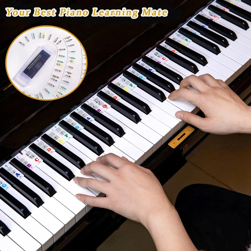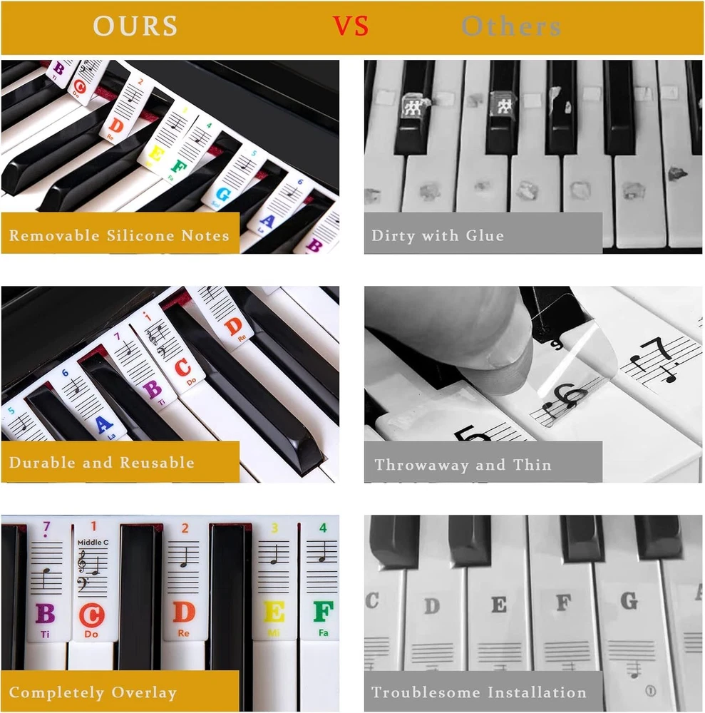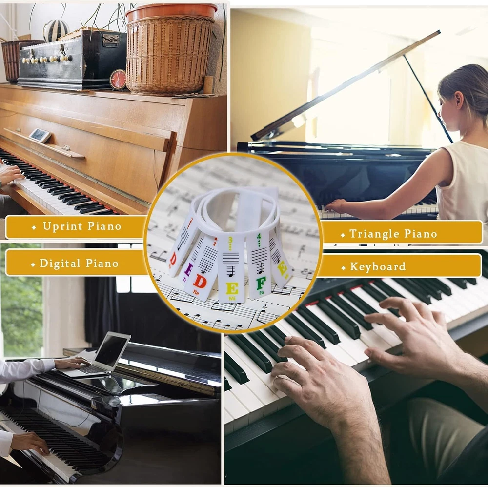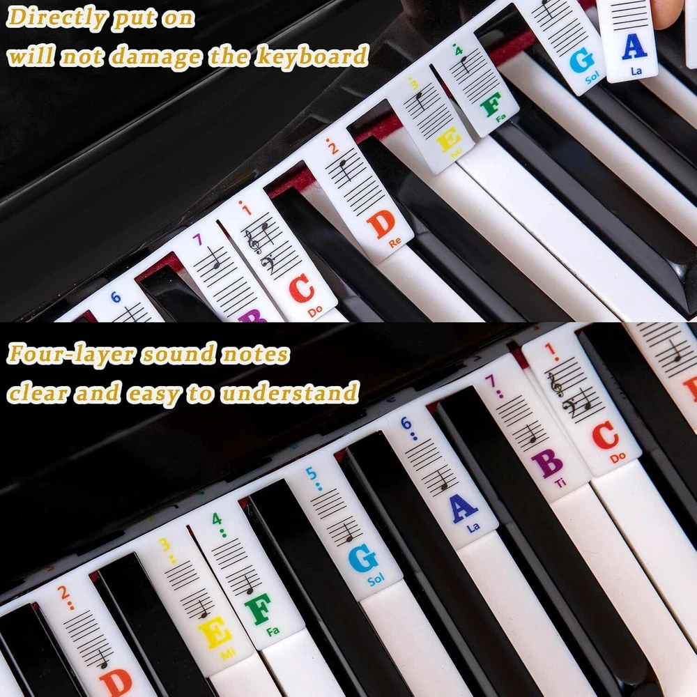 Piano Notes Guide for Beginner Learning, Removable Rainbow Colors Product Details Item Weight: 3.2 ounces Product Dimensions: 6.7 x 2.5 x 0.66 inches Country of Origin: China Color Name: Rainbow Colors Material Type: 硅胶 【Material advantages】Everjoys piano notes guide is different from others, piano key stickers adopted highly quality silicone material, it's softer and more flexible for your piano keyboard. Easy-to-install, Easy-to-remove, without leaving anytrack, and keeping your keyboard clean and tidy 【Clear Display, Easy to Identify】The piano key stickers are designed with a double staff display, the letters and notes size are clearly displayed, easy to read, no fading, and the notes on them are well placed, the middle C will be specially marked, which is a great help for beginners 【Removable & Portable】The piano key labels are made of silicone material which are removable and portable. No matter how you fold or curl the stickers, it fits your keyboards perfectly and easy to take away for class 【88 KEY FULL-SIZE】 It is suitable for standard 88 key piano, grand piano, upright piano, 88 key digital piano and keyboard.You also can use it for All 88/61/54/49/37 Keys piano 【Great Gift】The piano keyboard notes marker is a practical piano teaching or learning tool. It comes with a plastic box for convenient storage and carrying. You can send piano keyboard notes guides to kids and other piano beginners as a birthday or festival gift