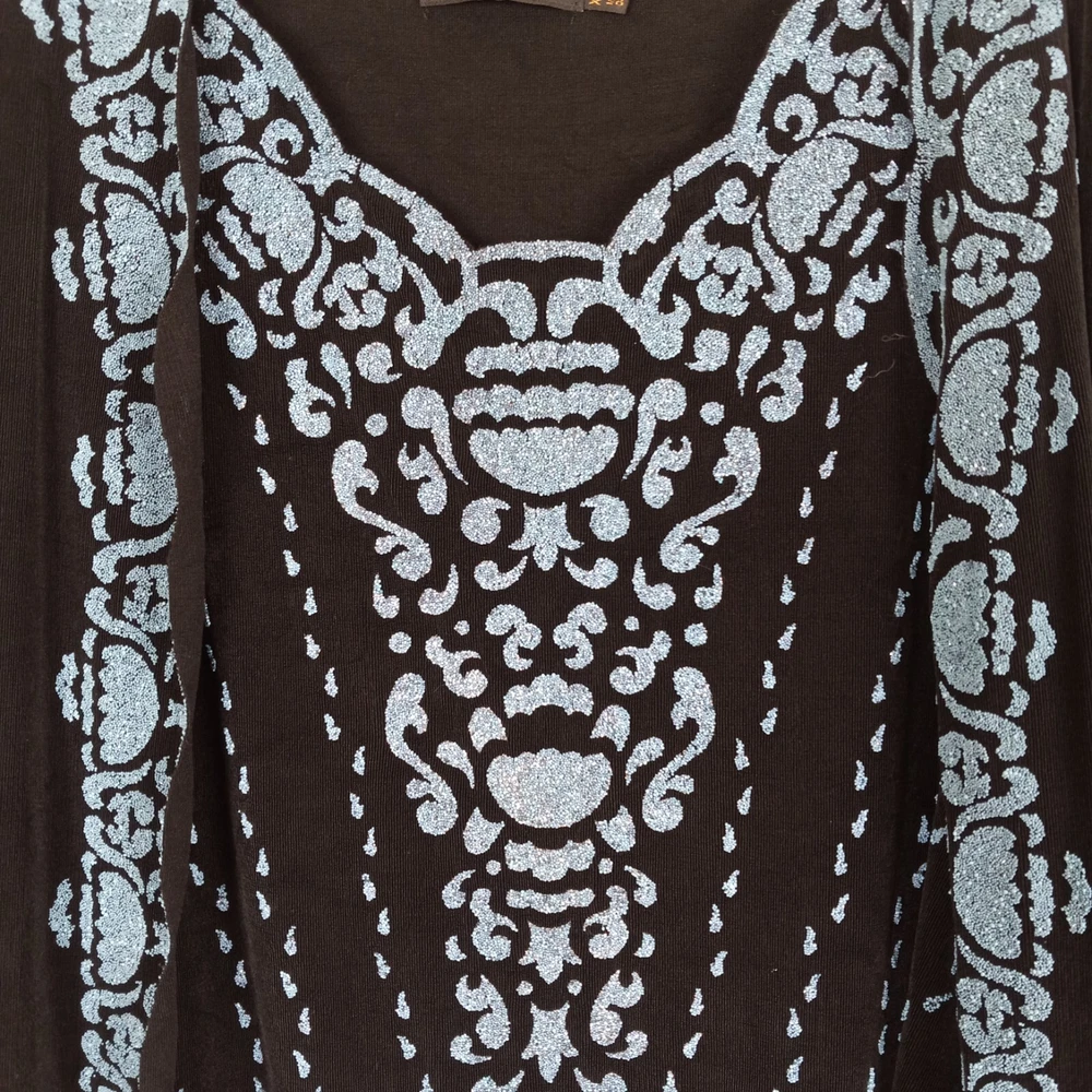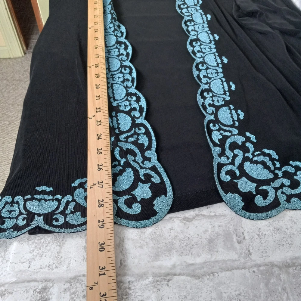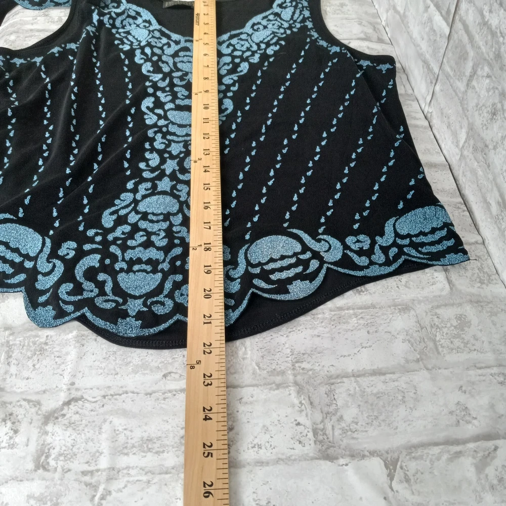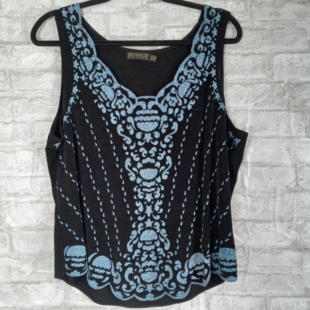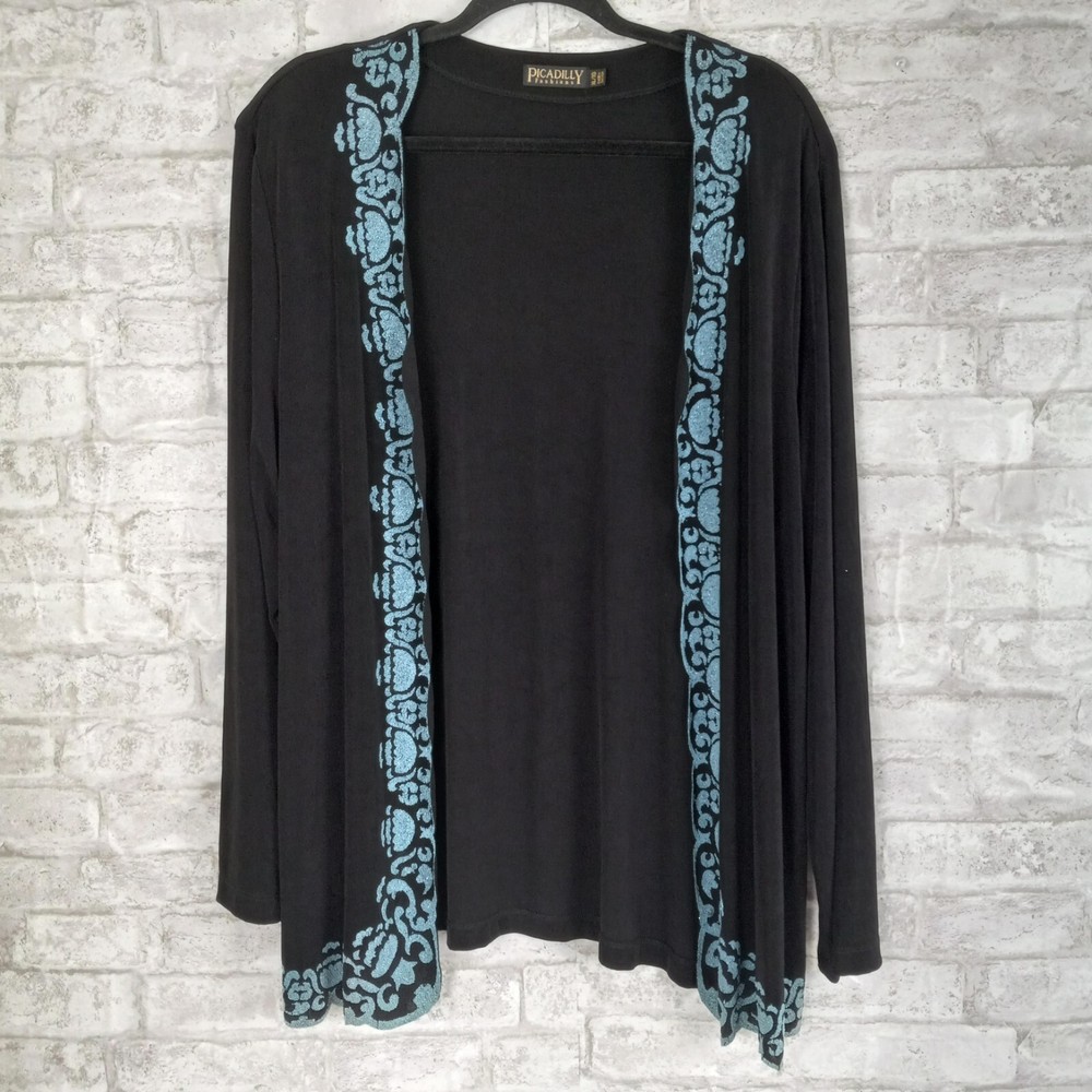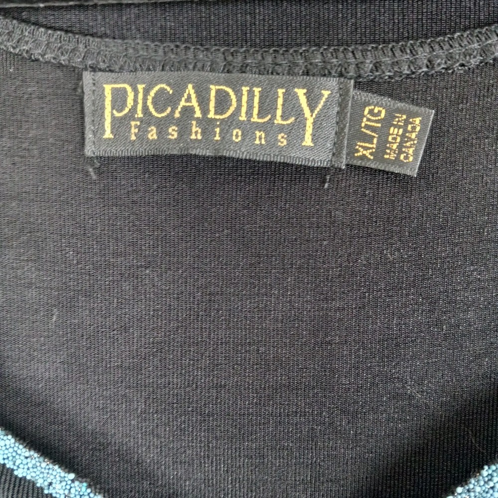 The Picadilly Cardigan Jacket Set in black is a stylish and elegant outfit perfect for cocktail evenings and formal events. This 2-piece set includes a long-sleeve cardigan with intricate beading, a pullover closure, and a matching tank top. Made from a blend of spandex and acetate, the stretchy material offers a comfortable fit for size XL women. The classic fit and vintage theme make it suitable for all seasons, whether it's winter, summer, fall, or spring. Made in Canada, this outfit exudes sophistication and glamour, ideal for those seeking a chic and timeless look. The blue details and more like crushed beads, no sewn on beads.