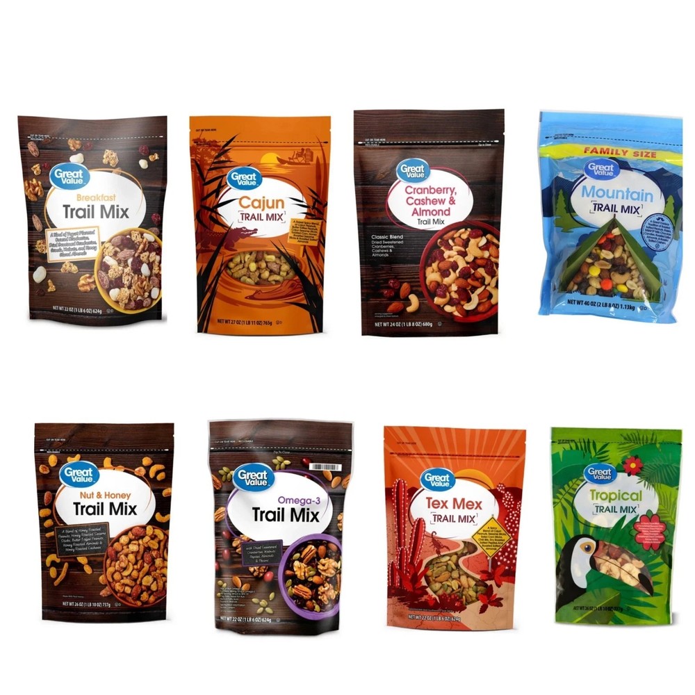 The Great Value Trail Mix 22 to 26 oz Bags offer delicious and convenient savory snacks for on-the-go enjoyment. With a variety of nuts, seeds, and dried fruits, each serving provides a satisfying blend of flavors and textures. These pantry staples are perfect for those looking for a quick and easy snack to munch on while traveling or engaging in outdoor activities.