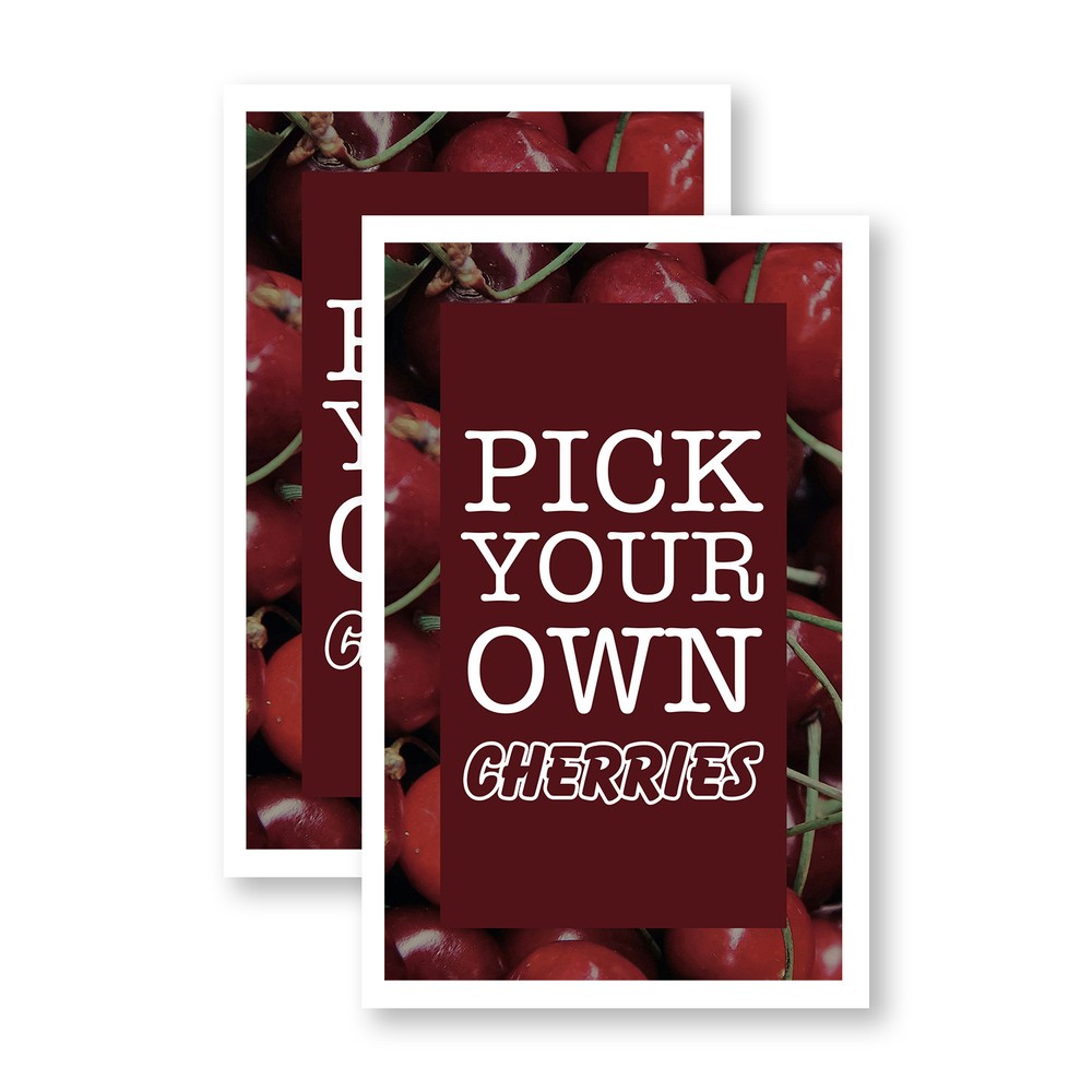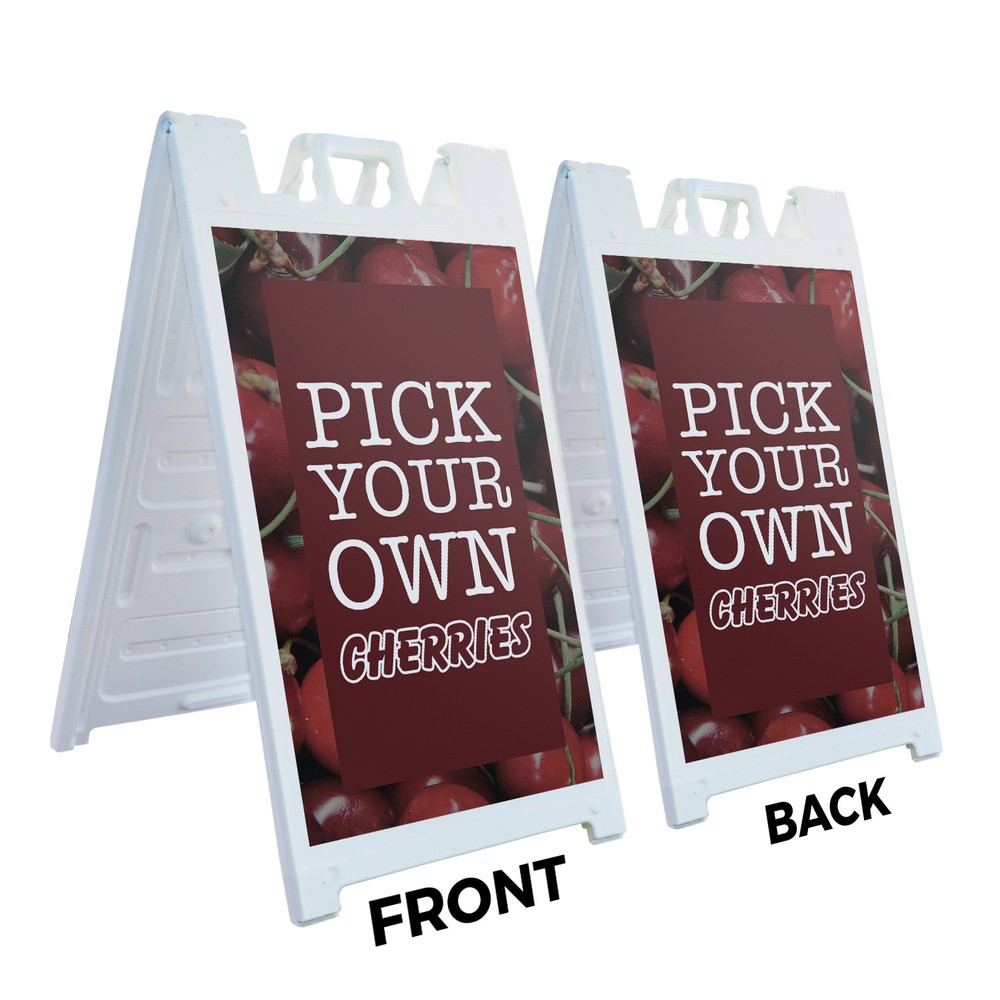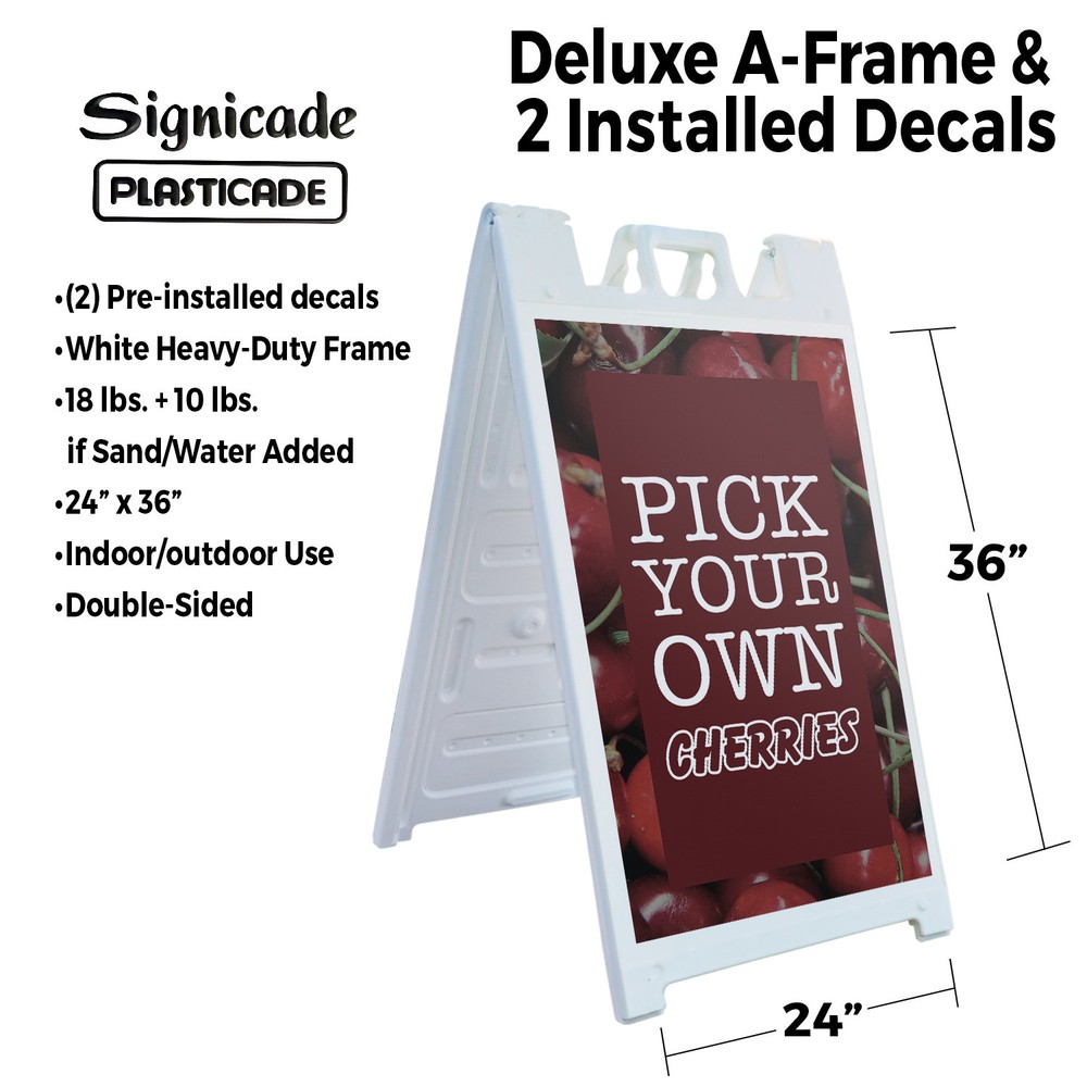 Pick Your Own Cherries 24" x 36" Double Sided A-Frame Sidewalk Sign Includes 2 Installed Decals Foldable Portable White Signicade Sandwich Board Sweet Fruits Orchard Fresh Seasonal Favorites Universal 2 eBay Template by Finest Design Vinyl Banners Aluminum Signs Safety Signs Yard Signs Designer Aluminum Signs Novelty Signs Vinyl Banners Aluminum Signs Safety Signs Yard Signs Designer Aluminum Signs Novelty Signs Description Pick Your Own Cherries Heavy Duty A-Frame Sidewalk Sign Sweet Juicy Seasonal SignMission Deluxe A-Frame Signs Heavy-Duty - Portable - Reusable - Weather Resistant A-Frames, also known as sandwich board signs, are an easy and affordable way to advertise your business or event. The durable thick plastic frame allows them to be placed both indoors and outdoors in any conditions except extreme weather. They are also extremely easy to set up, take down, and move from one location to another as needed. Our Signicade Deluxe A-Frame is available with two installation options: Decals Installed – The sign graphics are printed on high-quality vinyl decals that come pre-installed on the frame. Corrugated Plastic Signs Installed – Includes two 4mm corrugated plastic sign inserts that are attached using self-adhesive Velcro (included). Need to switch up your messaging? Extra sets of inserts are available in both decal and corrugated plastic options. Order multiple sets and change your message in just a few minutes! Simply search for SignMission 24” x 36” sign inserts to get additional replacements. Product Features & Specs (2) 4mm Corrugated Plastic Signs OR Pre-Installed Decals Self-Adhesive Velcro (For corrugated plastic option) White Heavy-Duty Frame 18 lbs. + 10 lbs. if Sand/Water Added 24” x 36” Removable Sign Graphics Indoor / Outdoor Use Double-Sided A-Frame Features Weatherproof: The combination of high-quality plastic and added weight from sand/water makes these signs perfect for outdoor use. Rain or shine, your A-Frame sign can endure it all. Maximum Visibility: Because every A-Frame is double-sided, you can make sure everyone sees your message. Portable: The collapsible A-Frame and convenient handle make it easy to move your sign from one location to another. Reusable: Store your signs and use them as you always have, swap inserts to change your messaging, and use your A-frame signs for years to come. Weight: 18 lbs. (Weight does not reflect when the frame is filled with water or sand, which can add 10 additional lbs. when full.) Details: Durable heavy-duty plastic frame with a regressed double-sided sign area (24”x36”). Foldable with a molded handle for easy grip and carrying. Fillable frame for greater stability. Swappable corrugated plastic graphics or pre-installed decals. Portable. Uses: Indoor/Outdoor. Trade shows. Sidewalk advertising. Daily specials and menus for restaurants. Point-of-purchase displays. Event and foot traffic. Directional signage. Estimated Lifespan: 5+ years with proper placement and care. Size: 45"H x 25"W x 3"D - Frame; 24" x 36" Graphic Area.