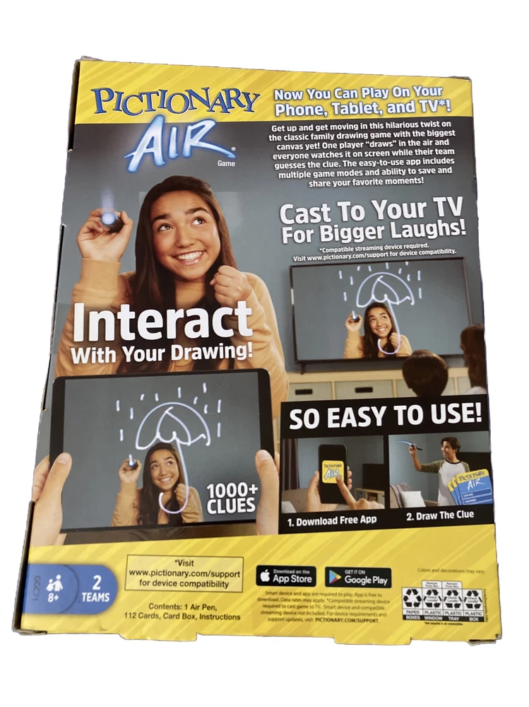 Get ready for endless fun with the Pictionary Air Game! This family board game is perfect for players of all ages, genders, and skill levels. With its innovative design, you can draw in the air and see your creation on a screen, making it a unique and exciting experience for everyone. This board game features the Game Title Pictionary and is made by the trusted brand Mattel. This drawing game is perfect for gatherings with family and friends. It's a Toy of the Year 2020 award winner and has several features like availability for iOS and Android devices. The Pictionary Air Game has a minimum requirement of 2 players, making it an excellent choice for a game board. You'll have a blast creating and guessing drawings while enjoying the interactive experience.
