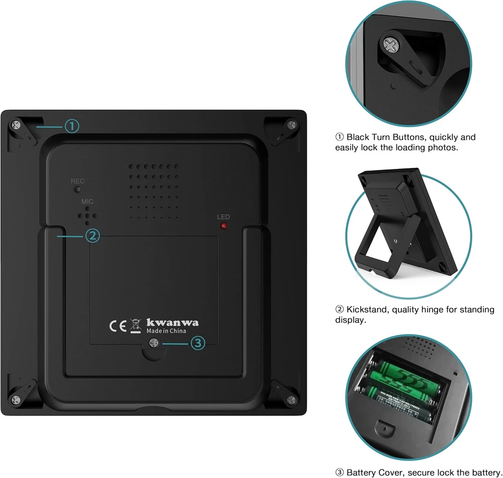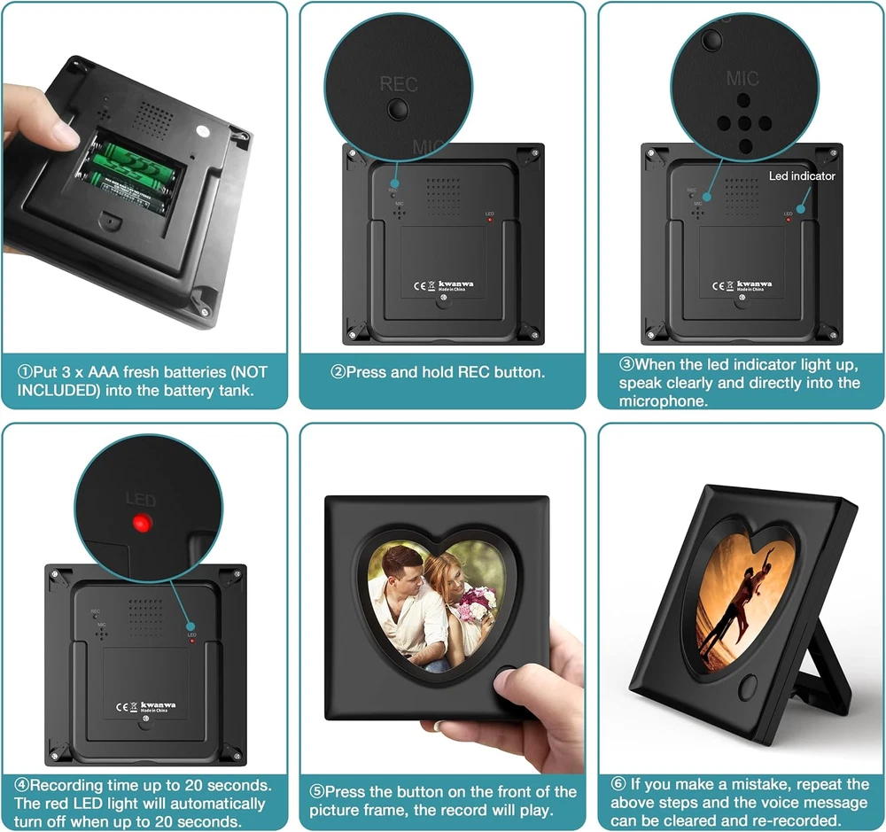 A TALKING PICTURE FRAME- What can be a better gift than A Talking Picture Frame that captures your best moments with your loved ones? Built-in voice recorder allows you to record up to a 20 second message. Surprise your family and friends with a lovely and truly momentous memory, finely engraved in Voice Recordable Picture Frame. HOW TO USE- Put 3 x AAA batteries (NOT INCLUDED) in the battery tank. Press and hole the REC button of the back, when LED lights up, speak Clearly into the microphone. The red LED light will automatically turn off when up to 20 seconds. If you make a mistake, the voice message can be cleared and re-recorded. Press the button of the front, the recorded voice will play. ECO-FRIENDLY- ABS material are recycled. No trees were harmed in the marking of these photo frames. Cute designed frame with amazing durability. Comes with easy opening tabs at the back for easy access. The crystal clear PVC front will protect your picture and give a clear view of your picture and preserves the life of your photo. Extremely carefully packaged to ensure it arrives safely! PERFECT SIZE- The picture frame fits 3.9 x 3.9 inch photos. The frame size is 5.5*5.5.It is perfect for your office desk, night table, tabletop, office desk, coffee table, bookshelf or wall shelf. Easily catching a happy memory. GREAT GIFTS- The small photo frame with personalized voice. It’s use as family picture frame, baby photo frame, dog picture frame. It is a great gifts for birthday, wedding gift, memorial, mothers day gifts, father's day gifts, valentine's gifts, teacher appreciation gifts, graduation gifts, christmas gifts. Product Description Picture Frame with Personalized Voice 20S Create your own decorative set to display your most memorable moments! KWANWA collects these wonderful moments and beautiful voice of life together with you,, and keeps them forever, which is the perfect addition to any home & office decor It's more than a gift, it's your love. KWANWA Recordable Voice Picture Frames. Up to 20 seconds voice-recordable picture photo frame, click the play button to play the recorded sound, the sound is loud and realistic, permanently saved. Recorded voice message can be kept even if the batteries were dead or take out the batteries. You can re-record message by repeating the recording steps.( NOTE: The previous message will be erased automatically after re-record a new message.) Life is colorful and recordable.