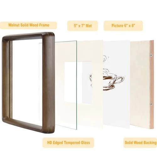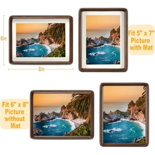 Return Policy Fast Delivery Trusted seller 6x8 Picture Frame Set of 2, Display Picture 5x7 with Mat or 6x8 Without Mat, Made of Natural Walnut Wood, HD Tempered Glass, Vertical or Horizontal Display for Tabletop and Wall Product Description Handcrafted from Natural Walnut Wood: Walnut wood stands out among many woods for its elegant grain, warm hues, and exceptional durability. We only cut and polish it, complemented with a wood wax oil for maintenance. Elegance in Every Grain, each piece is a testament to fine craftsmanship, adding warmth and sophistication to your cherished memories. Featuring a natural pine wood back panel with concealed ball-spring clips, pop-in/pop-out design offer effortless photo installation and replacement. When displayed on a tabletop, the all-wood construction eliminates unsightly metal hardware, resulting in a sleek and harmonious visual appeal. The back panel features a curved groove designed to align seamlessly with nail hooks, ensuring simple and sturdy wall mounting. This walnut wood frame is equipped with high-definition tempered glass, featuring polished edges for clarity, transparency, and safety without sharp edges. Tempered glass breaks into harmless small pieces, ensuring safe use and giving you peace of mind. A Unique Gift Choice: Gift a touch of sophistication with our exquisite walnut wood frames. Each frame is one-of-a-kind, boasting its own distinct wood grain and natural variations, each frame is a timeless piece of art. Perfect for friends, loved ones, or yourself, these frames preserve memories in style. A unique gift choice that radiates warmth and care. Versatile Display Options: This 6x8 matted picture frames can be showcased vertically or horizontally on a table, or mounted on the wall in either orientation. Tailor the display to your liking, whether it's for a personal touch on a desk or a stunning wall exhibit. The choice is yours for the perfect presentation. A Perfect 6x8 Decorative Frame: ideal for showcg 6x8 photos without mat, and fit for picture 5x7 photos with mat. A great gift for holidays, Christmas, Mother's Day, Father's Day, birthdays, weddings, and special occasions. Display your photos, artworks, travel mementos, concert programs, awards, certificates. Shipping Returns Payment Shipping Shipping is FREE to all addresses other than APO/PO boxes in the lower 48 states. All our stock ships from US-based warehouses. Shipped via USPS or UPS (depending on location and package weight) Unless stated otherwise, all orders will ship within 24-72 hours of your payment being processed. Check our feedback to see the great reviews of FAST shipping we offer. Returns Seller does not accept returns Payment We currently accept payment via eBay managed payments only. Once payment is cleared, we will dispatch your shipment within 1-3 business days. Please refer to the "Shipping" tab for more information regarding shipping speed to your destination.