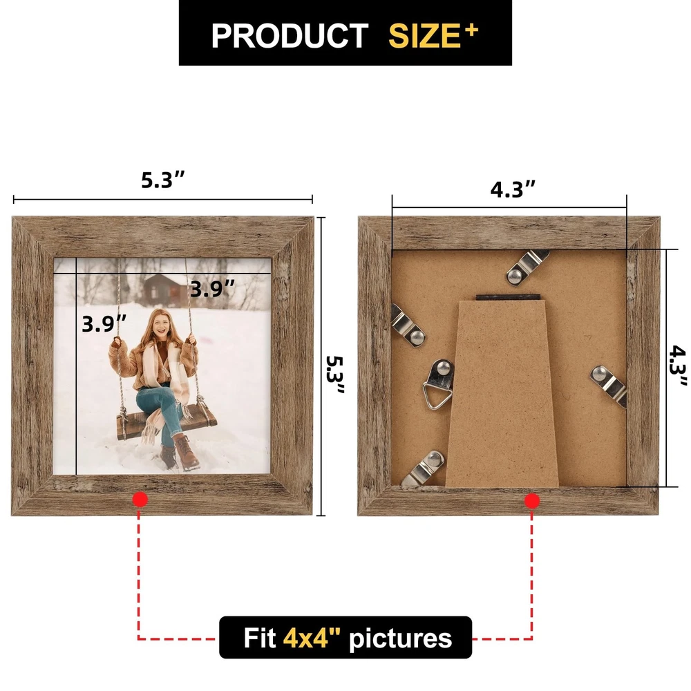 Picture Frames 4x4 Set of 2 Rustic Wood Grain Photo Frame for Gallery Wall Mounting or Tabletop Display Product Details Color: Rustic Wood Size: 4x4 Brand: TOFOREVO MPN: TF-XL-2pcsS4inFrameRB-XK99 UPC: Does not apply EAN: Does not apply Brand: TOFOREVO Color: Rustic Wood Product Dimensions: 4"L x 4"W Shape: Square Mounting Type: Freestanding Frame Material: Engineered Wood Finish Type: Distressed Style: Rustic Theme: Wood Occasion: Grandparents Day, New Year, Retirement Brand: TOFOREVO Color: Rustic Wood Product Dimensions: 4"L x 4"W Shape: Square Mounting Type: Freestanding Frame Material: Engineered Wood Finish Type: Distressed Style: Rustic Theme: Wood Occasion: Grandparents Day, New Year, Retirement Special Feature: Easel Back Number of Items: 2 Orientation: Vertical Target Audience: Unisex Adult Cover Material: Polyvinyl Chloride (PVC) Item Weight: 0.24 Kilograms Back Material Type: Medium Density Fiberboard Unit Count: 2.0 Count Included Components: 2 Picture Frames Recommended Uses For Product: Wall Display, Tabletop Display, Gifting for Occasions Size: 4x4 Item Weight: 8.4 ounces Item model number: TF-XL-2pcsS4inFrameRB-XK99 Finish types: Distressed Batteries required: No 4x4 Picture Frame: 2 Pack Rustic Wood Grain Square 4x4 Picture Frames, finished with a rustic style accents. Giving you the distressed look. It's great for wall or farmhouse decor. Material: Made of sturdy MDF wood, not easy to deform, no smell. And come with high definition organic glass(polymethyl methacrylate ), Shatterproof, Durability and Not fragile. Use and Display: Backing fixed with 4 360 metal tabs. Easy to put photos in. Stands up well and not wobbly. Wall mountable display horizontally or vertically. Nice decor. on the shelf or blank wall. Perfect Design: Great for displaying photos that something means so much, and can look at everyday! Also a excllent gifting to somebody. Well to decorate room with. Protective Packing : Well packaging that helps ensure safe delivery. For personal use or as a gift to friends. Hurry to click and add to your cart for your good memories.