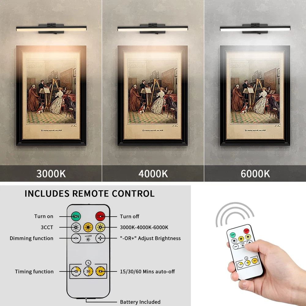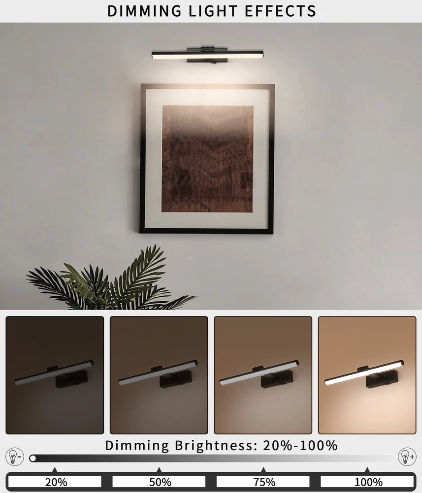 SLEEK AND MODERN DESIGN BATTERY PICTURE LIGHT:The wireless picture lights for paintings features a sleek and modern design that adds sophistication to any artwork or picture. It's perfect for highlighting your favorite pieces. CONVENIENT BATTERY-OPERATED AND RECHAREABLE DESIGN:The battery operated wall lights operates on batteries, making it easy to install and use without the hassle of wires or cords. You can place it anywhere you want without having to worry about outlets. CUSTOMIZABLE DIMMABLE FUNCTION RECHARGEABLE PICTURE LIGHT:With the ability to dim the art lights for paintings battery operated, the wireless picture light allows you to create a personalized ambiance for any space. Whether you want a soft glow or bright illumination, this rechargeable wall lights has you covered.tc. ENERGY-EFFICIENT AND CO-FRIENDLY PICTURE LIGHTS FOR WALL:Designed with energy-saving technology, the above picture lights is an eco-friendly accent lighting option that saves you money on your energy bills. It also has a long battery life that lasts for hours. WIDELY APPLICATIONS:The battery operated wall sconce is perfect for a wide range of applications, including artwork, photographs, diplomas, and more. Whether you're a professional artist or a DIY enthusiast, this spot lights indoor is a must-have addition to your collection.
