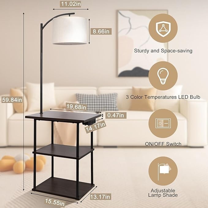 Lámpara de pie resistente: la mesa auxiliar con lámpara combinada presenta una construcción de madera natural que agrega encanto vintage e incluye almohadillas ajustables para los pies que garantizan su durabilidad y estabilidad. Resistente al agua y a los rayones, es muy fácil de limpiar y la luz incorporada no se caerá si tu mascota choca con ella. Mesa auxiliar con estación de carga: esta lámpara de pie LED viene con un puerto de carga USB de 5 V/2,1 A, un puerto de carga tipo C y una toma de CA. Cuando te relajas en el sofá o la cama, puedes usar las mesas auxiliares con puertos USB y enchufes para cargar rápida y fácilmente tu teléfono, auriculares Bluetooth o tableta, mientras disfrutas del ambiente cálido de la lámpara de pie con la mesa. Lámpara de pie cálida mejorada: las lámparas de pie de lectura funcionan con bombillas LED E26 de bajo consumo (3000 K/4500 K/6500 K) y duran más de 10 000 horas. Las pantallas de lino y la luz cálida crean un rincón de lectura cálido que combinará muy bien con tus muebles. Placa de empalme extragrande: la lámpara de pie con tablero de 3 capas fijado a la mesa maximiza el espacio de un área pequeña, brindando más áreas de almacenamiento y exhibición para su teléfono, libros, tazas de café, computadoras, revistas y más. Gran adición a habitaciones de adultos, salas de manualidades, dormitorios o cualquier rincón estrecho. Cubierta de tela giratoria y fácil montaje: la lámpara de pie con estantes viene con dibujos de montaje y métodos de instalación en video, sin necesidad de piezas adicionales. Solo necesita armarlo en unos minutos y es muy simple. Después de la instalación, la pantalla de la lámpara se puede girar 180 grados, puede iluminarla libremente y con precisión donde lo necesite.