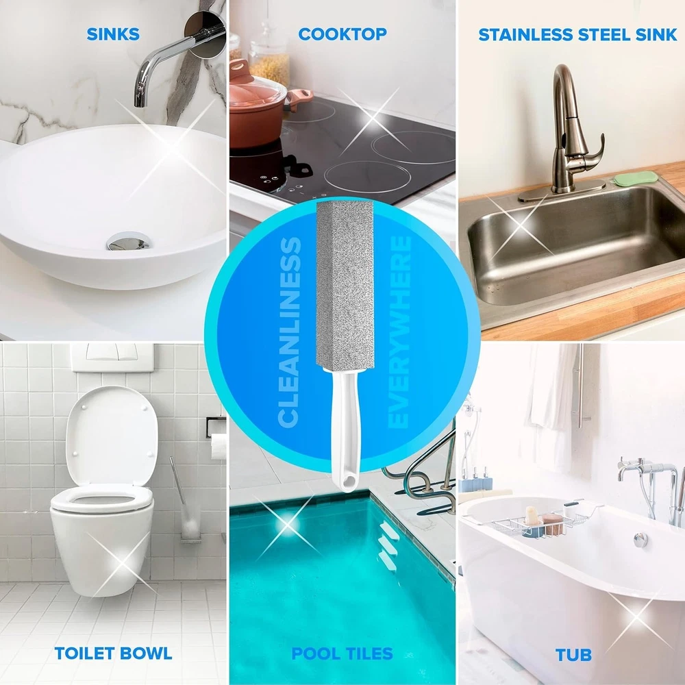 About this item Surface Compatibility: Effectively removes hard water stains, calcium deposits, and stubborn grime from porcelain, pool tiles, toilets, barbecue grills, steel, and stone surfaces. Abrasive Action: Utilizes gentle abrasive properties to tackle tough stains without causing scratches on delicate surfaces. Ergonomic Design: Features a heavy-duty plastic handle to protect hands during cleaning and allow access to hard-to-reach areas. Compact Size: Measures 5.25 inches x 1.5 inches x 1.5 inches (13.34 x 3.71 x 3.71 cm), making it convenient for storage and transportation.