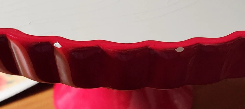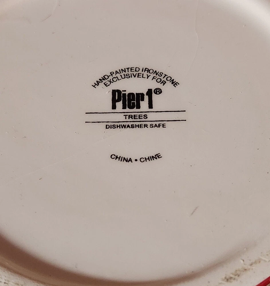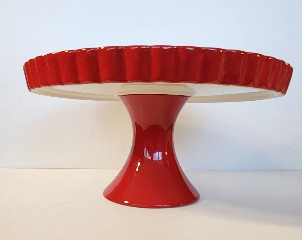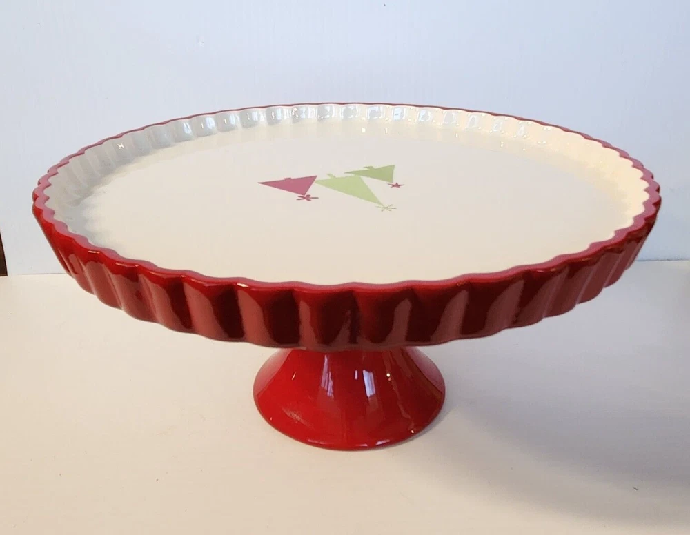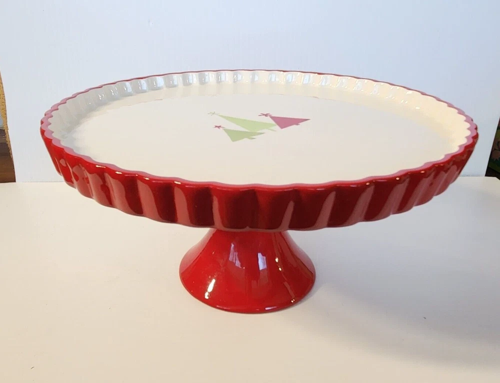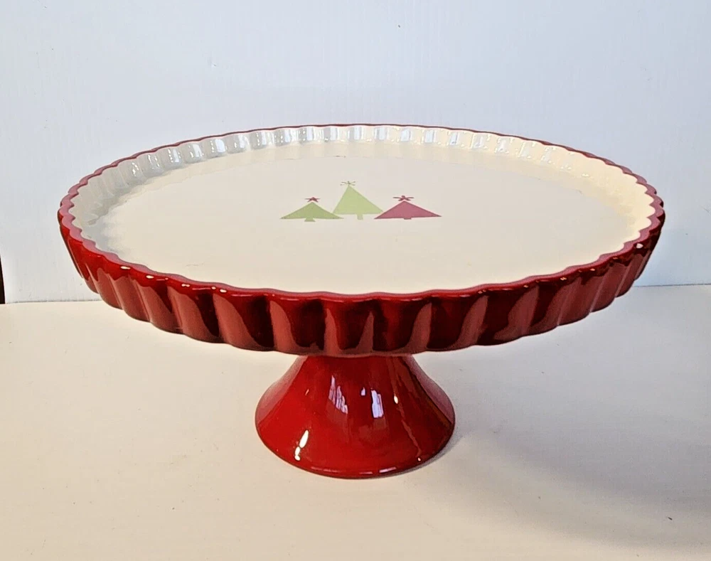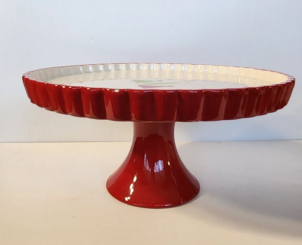 Pier 1 Ceramic Christmas Trees Pedestal Cake Pie Stand Hand Painted Ironstone Measuring 11" round x 5 1/2" tall. In good preowned condition with two tiny white spots along the red edge as shown in photos and a slight crazing on top white space. Please see all the ENLARGED PHOTOS for more details. Will be packaged well for a safe delivery!