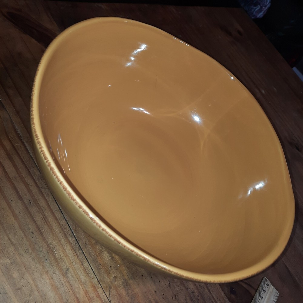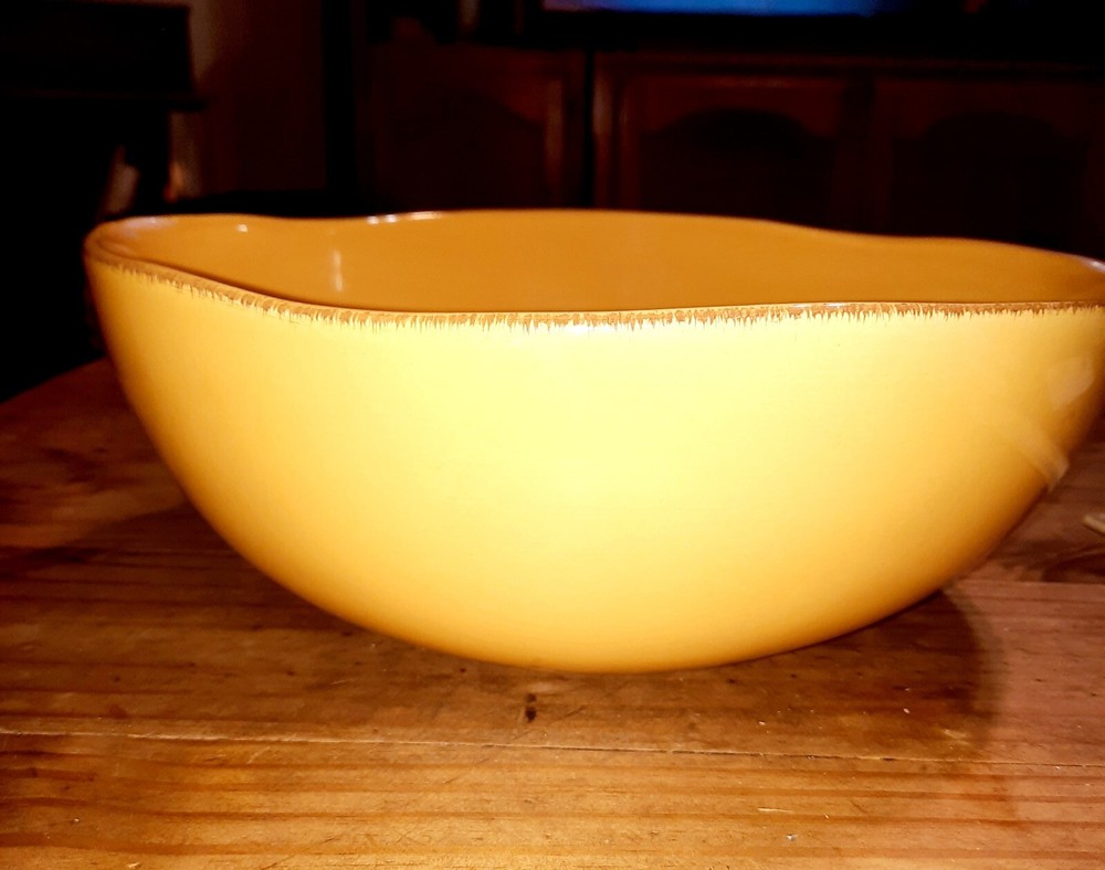 Enhance your dining experience with the Pier 1 Imports Elemental Mango Large Serving Salad Bowl. Crafted from high-quality stoneware, this 11-inch round bowl boasts a vibrant yellow hue that adds a splash of color to any table setting. Designed with practicality in mind, the bowl is dishwasher, microwave, and oven safe, making it a versatile addition to your kitchen. From casual gatherings to festive dinners, this salad bowl is suitable for all occasions. Its durable earthenware construction ensures long-lasting use, while the glossy finish remains as inviting as ever. The bowl's stackable feature and nesting design provide convenient storage when not in use. Whether used for serving salads, fruits, or mixing ingredients, this bowl's functionality aligns with its charming decor.