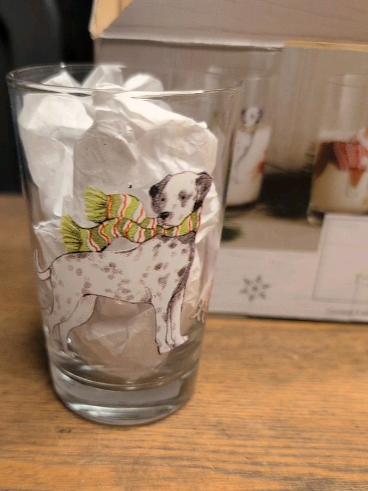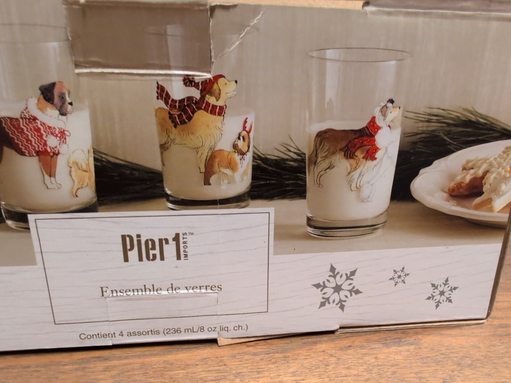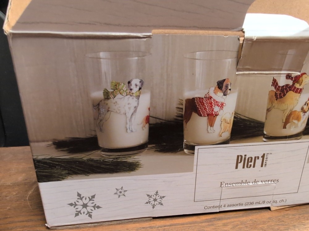 New Pier 1 Imports Christmas Dogs Glass Tumbler Set (Set of 4 )Hand Painted. Condition is New. Shipped with USPS Ground Advantage.