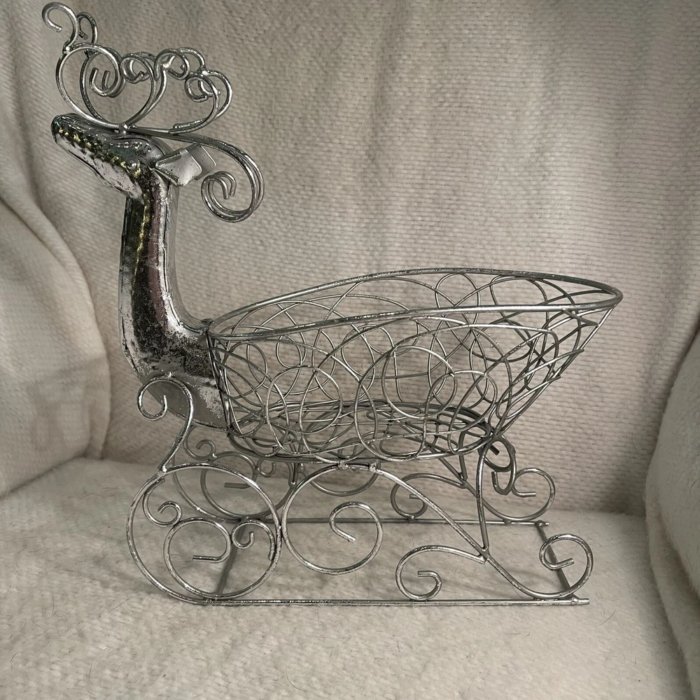 This beautiful Pier 1 Imports reindeer sleigh is a must-have for any Christmas decorator. The large, silver metallic finish of the sleigh and the intricate details of the reindeer figurine make it a stunning piece that will surely catch the eye of anyone who sees it. Measuring 12.5 inches in length and height, and 5.5 inches in width, this contemporary style sleigh is perfect for indoor use during the holiday season. It weighs 1.2 lbs and was manufactured in the 1990s. The sleigh is designed with a Christmas theme and features a reindeer subject, making it a perfect addition to any collection of holiday decor. Excellent condition. New without tags.