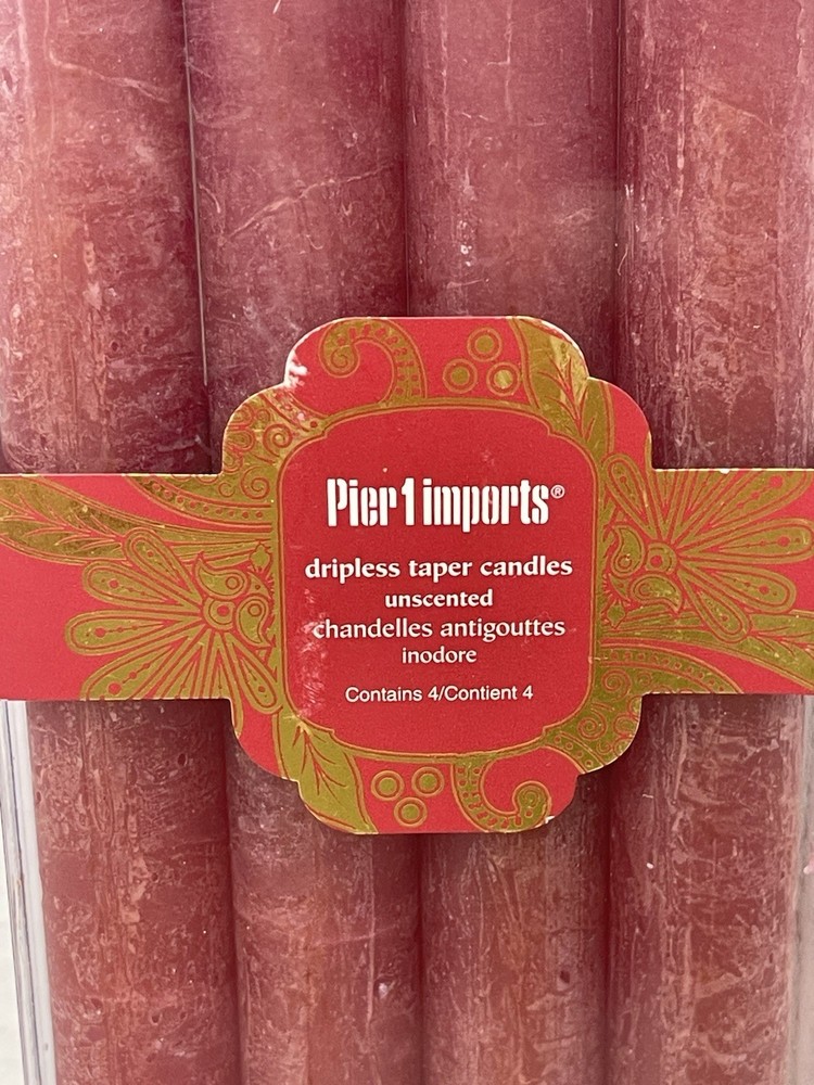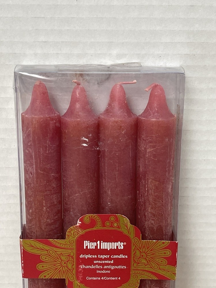New in Box - Pier 1 set of 4 - 10 inch dripless taper candles 1 inch diameter Color is a wine red, cherry red, burgundy. See photos. Excellent condition