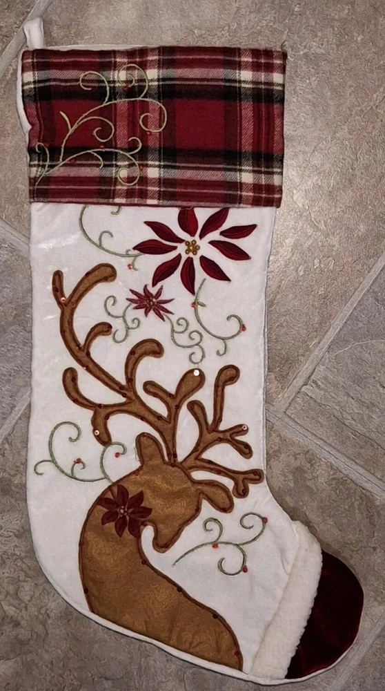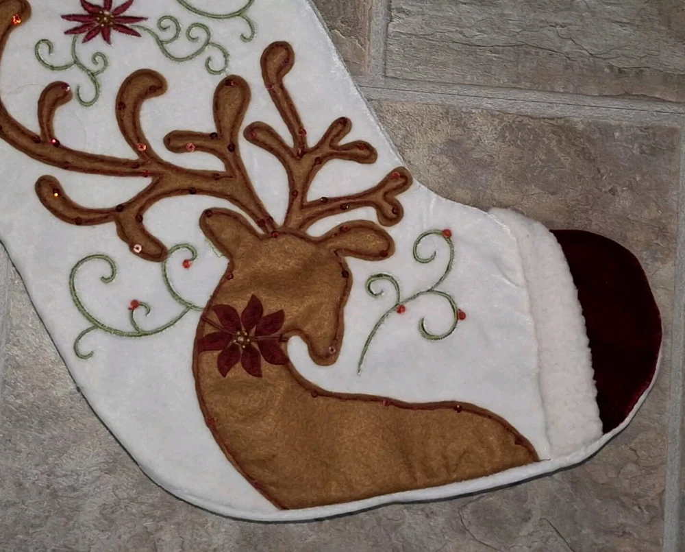 Reindeer Sock Sequins Embellished Pier 1 Reindeer Christmas Stocking Has crushed velvet feel See photos for measurements I consider this to be in good preowned condition There is some writing on inside - see last photo Please view all photos zooming in on them as they are part of the description for you to judge condition.