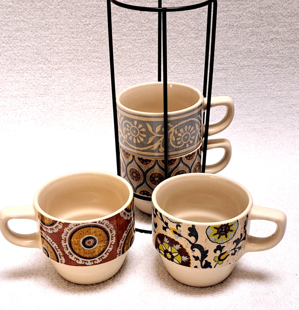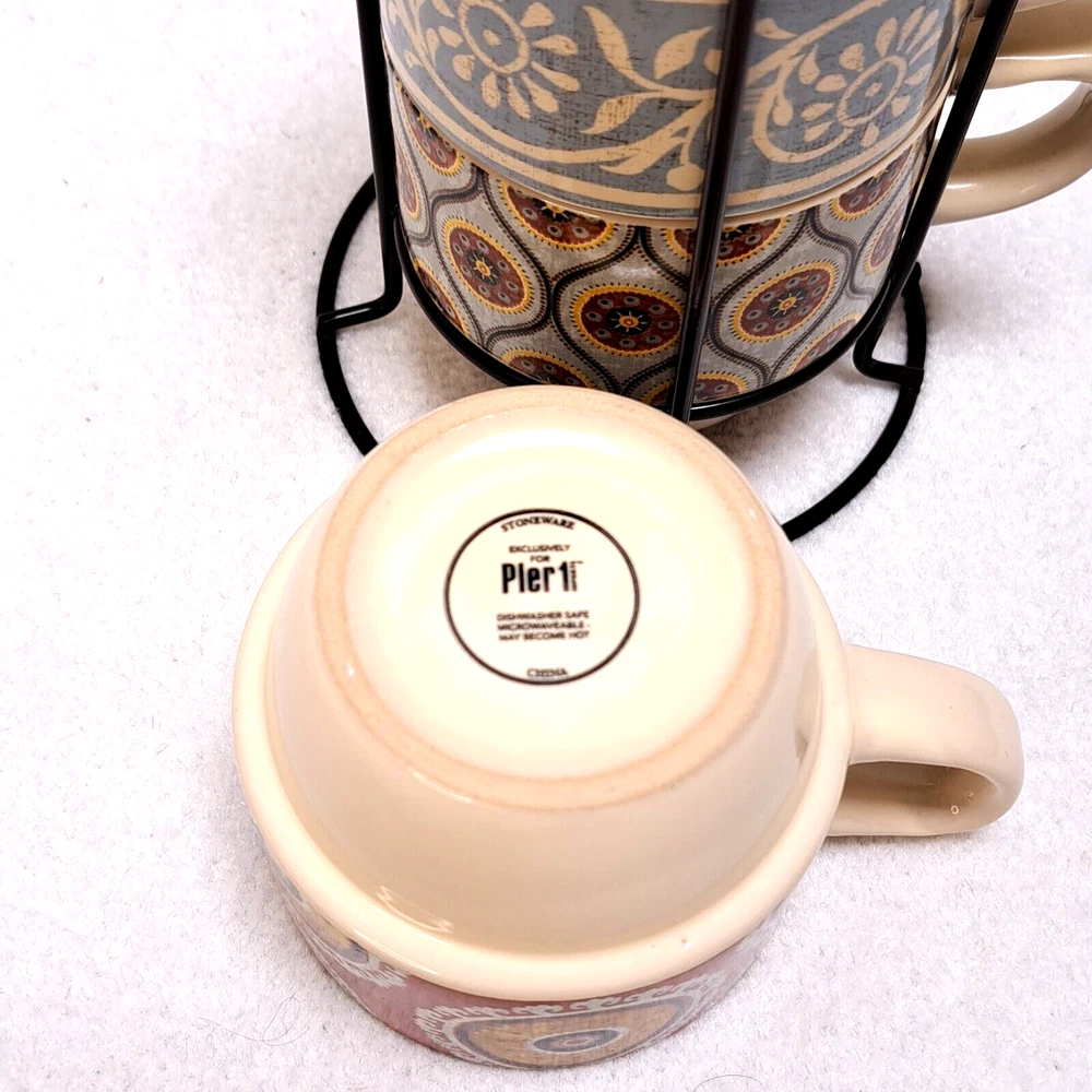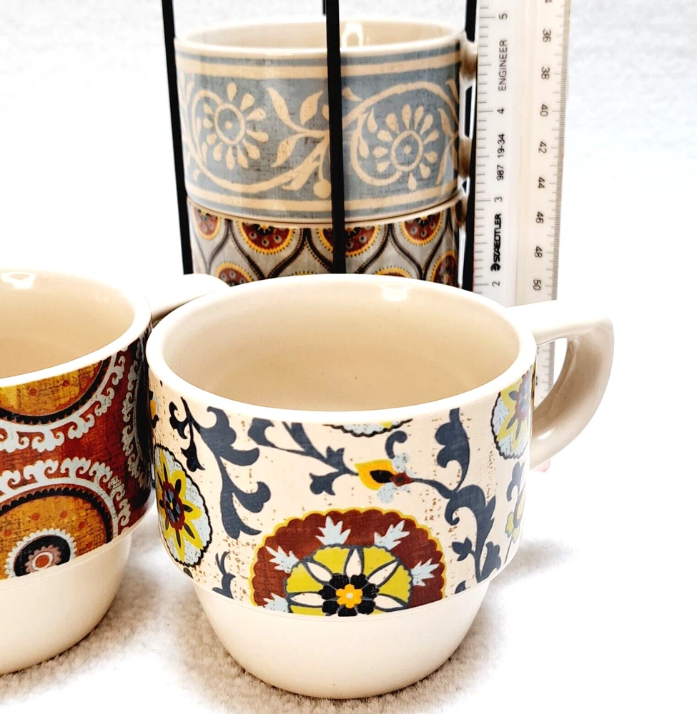 Add a touch of style to your coffee or tea time with this Pier 1 mug set. The set includes four ceramic mugs featuring a multicolor paisley pattern that adds a contemporary twist to your kitchen. The mugs are stackable, making storage simple. They also come with a round black vertical rack for easy storage. Each mug holds up to 8 fl oz and measures 3 inches deep. This coffee tea mug set is perfect for all occasions and can be personalized if desired.