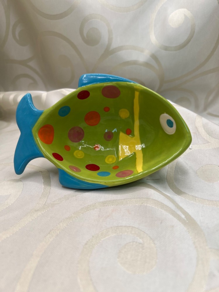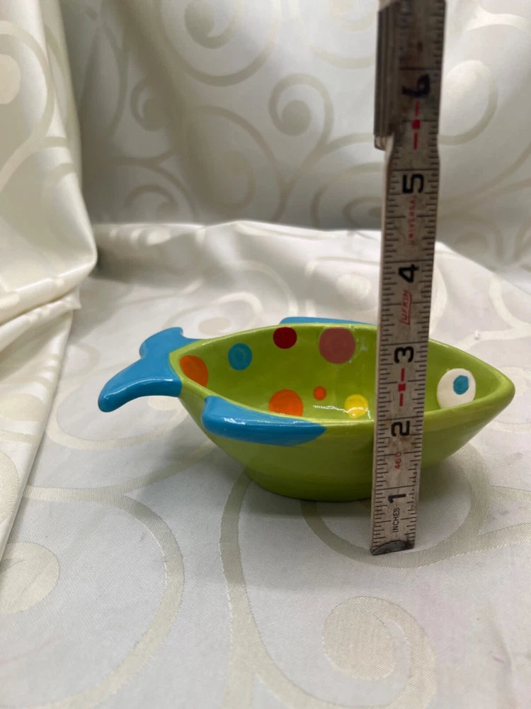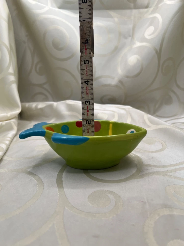 This is a Pier 1 Imports ceramic bowl featuring a green polka dot design with a fish theme. It is suitable for all occasions and can be used for serving sauces or dips. The bowl is crafted using art pottery techniques in China.