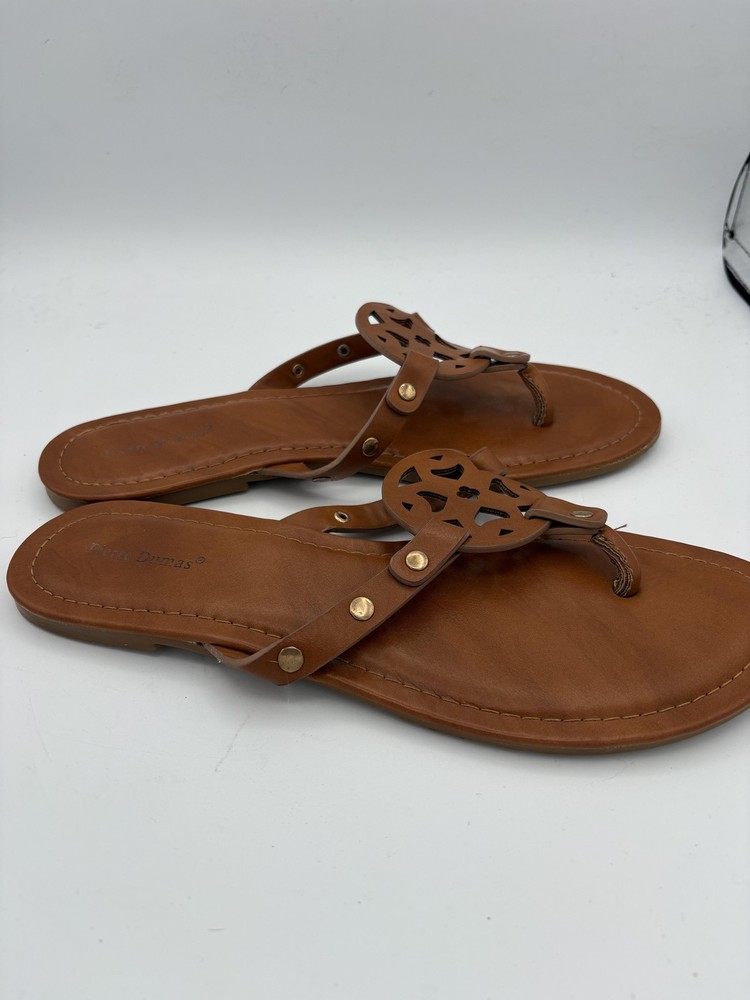 Brand: Pierre Dumas Item: Womens thong sandals with flat sole and decorative cutout medallion upper. Color: Brown upper and footbed with gold tone stud hardware and matching brown outsole. Gender/Size: Womens US size 10M; size equivalents include UK 8, EU 41, and AU 10. Material: Synthetic upper and lining with man made outsole and all man made materials construction. Design details: Round laser cut medallion at vamp with toe post, slim side straps with rivet studs, stitched footbed, and textured floral pattern outsole. Style/Model: Pierre Dumas thong sandals with medallion and stud accents. Tag details: Outsole label notes size 10M, all man made materials, and Made in China with material icons. Occasion/Use: Suitable for casual wear, summer outfits, beach trips, and everyday warm weather walking. Notes: Easy slip on thong sandals with neutral brown color and flat comfortable design.