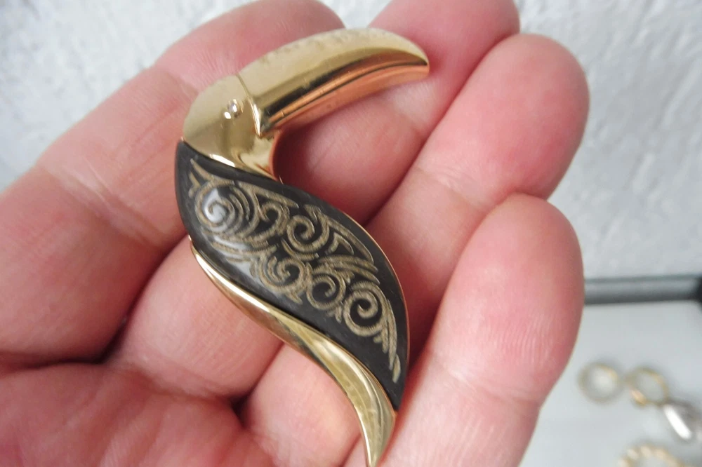 Pierre Lang Brooch, Bird: Toucan, Gilded with Onyx The description of this item has been automatically translated. If you have any questions, please feel free to contact us. Very nice pin, brooch from Pierre Lang . Bird: Toucan, gilded with black onyx (engraved decoration) , beautiful and high quality workmanship. Dimensions: approx. 5.5cm high, 3.7cm wide, weighs 16.6grams. Good condition (see photos)! Very nice pin / brooch, Pierre Lang ! More Pierre Lang jewelry in my shop! You can find many other beautiful, interesting, old and antique things in my other articles, take a look! All companies, brand names and trademarks indicated are the property of their owners and are used solely to identify and describe the products. The article was published before the 13th. Placed on the market in December 2024. Legal provisions Seller's notes This article is excluded from the General Product Safety Regulation 2023/988 (GPSR). Because they are either animal by-products, antiques, collector's items or works of art. Very nice pin, brooch from Pierre Lang . Bird: Toucan, gilded with black onyx (engraved decoration) , beautiful and high quality workmanship. Dimensions: approx. 5.5cm high, 3.7cm wide, weighs 16.6grams. Good condition (see photos)! Very nice pin / brooch, Pierre Lang ! More Pierre Lang jewelry in my shop! You can find many other beautiful, interesting, old and antique things in my other articles, take a look! All companies, brand names and trademarks indicated are the property of their owners and are used solely to identify and describe the products. The article was published before the 13th. Placed on the market in December 2024. This article is excluded from the General Product Safety Regulation 2023/988 (GPSR). Because they are either animal by-products, antiques, collector's items or Marke Pierre Lang Farbe Gold - Schwarz Produktart Brosche Herstellungsland und -region Österreich Thema Vögel Hauptstein & Perlen siehe Beschreibung Material siehe Beschreibung Geschlecht Unisex Ursprungsland Österreich Hauptsteinfarbe . EAN Nicht zutreffend