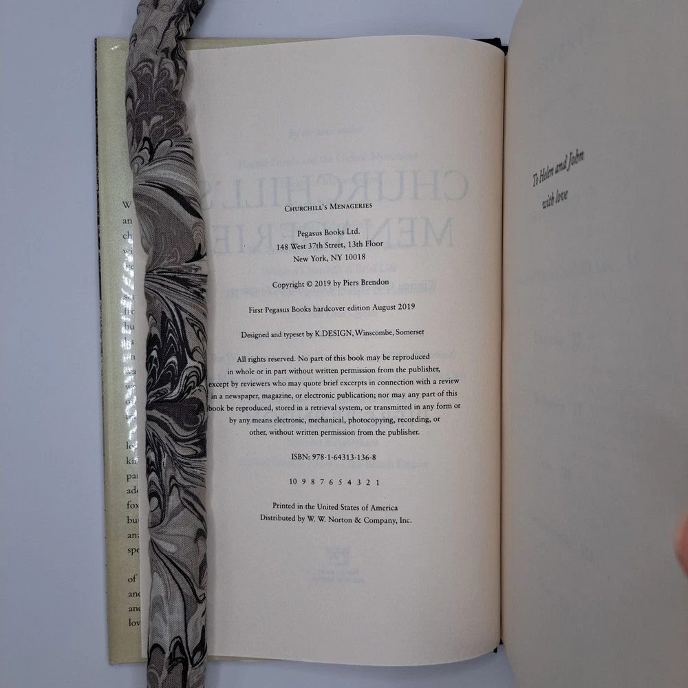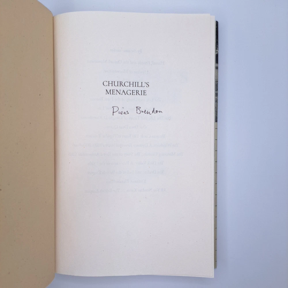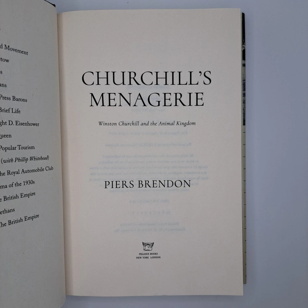 CHURCHILL'S MENAGERIE: WINSTON CHURCHILL AND THE ANIMAL KINGDOM [Signed] Author: Brendon, Piers Title: CHURCHILL'S MENAGERIE: WINSTON CHURCHILL AND THE ANIMAL KINGDOM [Signed] Publication: New York, New York: Pegasus Books, 2019 Edition: First Edition, First Printing Description: Octavo, 320 pages. In Near Fine condition with Near Fine condition dust jacket. Spine is black with off white lettering. Dust jacket protected by mylar covering, price uncut: "28.95" on front flap. Contains original receipt of purchase. Signed flat by Pers Brendon on half title page. Shelved in hallway. Seller ID: 1389366 Subject: Biography & Autobiography, European History, Politics, Government, and Law, Sciences, Math, Medicine, & Natural History Welcome to the eBay store of Second Story Books! DC's Oldest Rare and Used Bookstore, Second Story Books operates two open shops in the Washington D.C. metropolitan area. We have an extensive internet presence and provide accredited appraisals member ASA. This listing was created by Bibliopolis.