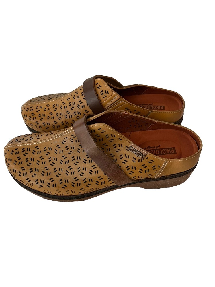 Step into comfort and style with these Pikolinos Die Cut Granada clog mules. The slip-on design with a round toe shape and low wedge heel style makes them perfect for travel and casual occasions. The honey color and bohemian theme add a touch of classic style, while the memory foam insole and arch support provide cushioned comfort. These shoes feature a strap and logo accent, as well as a rubber outsole for durability. The Pikolinos brand is known for its quality and these shoes are no exception. They are available in women's US shoe size 9-9.5 and EU shoe size 40. Whether you're looking for a comfortable pair of shoes or a stylish addition to your wardrobe, these Pikolinos clog mules are a must-have. New without the box. Never worn First quality from hi end dept store Size 40 fits US 9-9.5