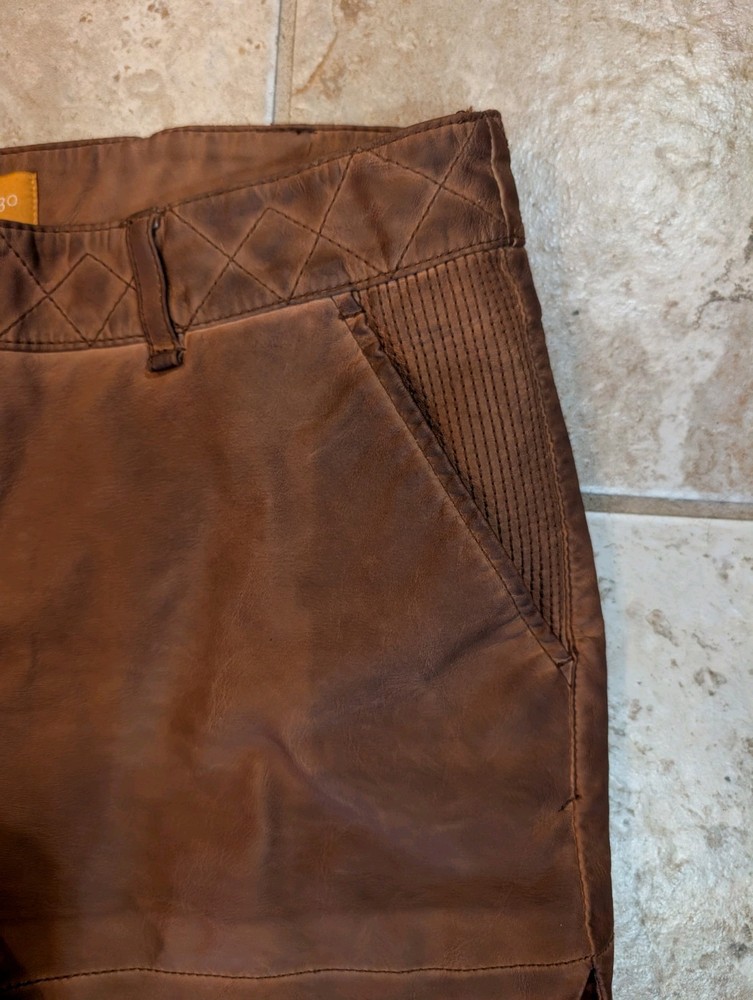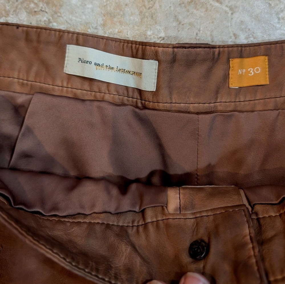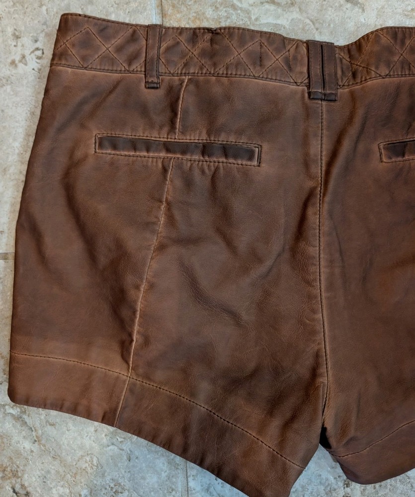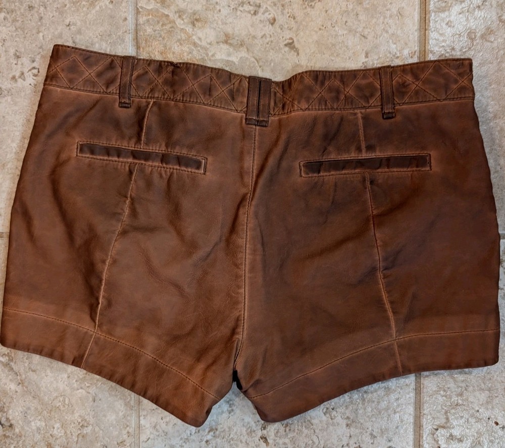 These Pilcro Anthropologie women's brown leather shorts in size 30 feature a zip closure, making them easy to put on and take off. The versatile style is perfect for casual occasions, while the pockets add functionality. Made from high-quality leather, these shorts are machine washable for easy care. With a regular fit and flat front design, they are suitable for walking and can be worn in the summer and spring seasons. The brand Anthropologie is known for its unique and stylish clothing, making these shorts a fashionable addition to any wardrobe. (R-106)