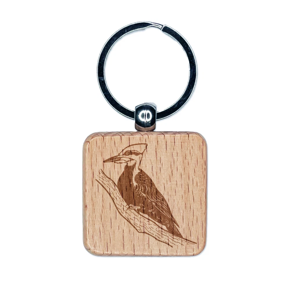 Pileated Woodpecker Bird on Branch Engraved Wood Square Keychain Tag Charm