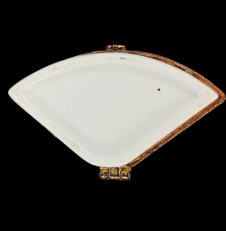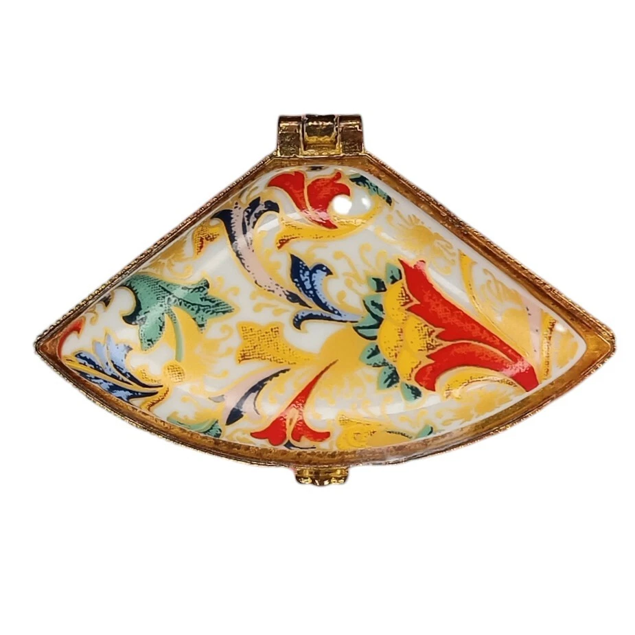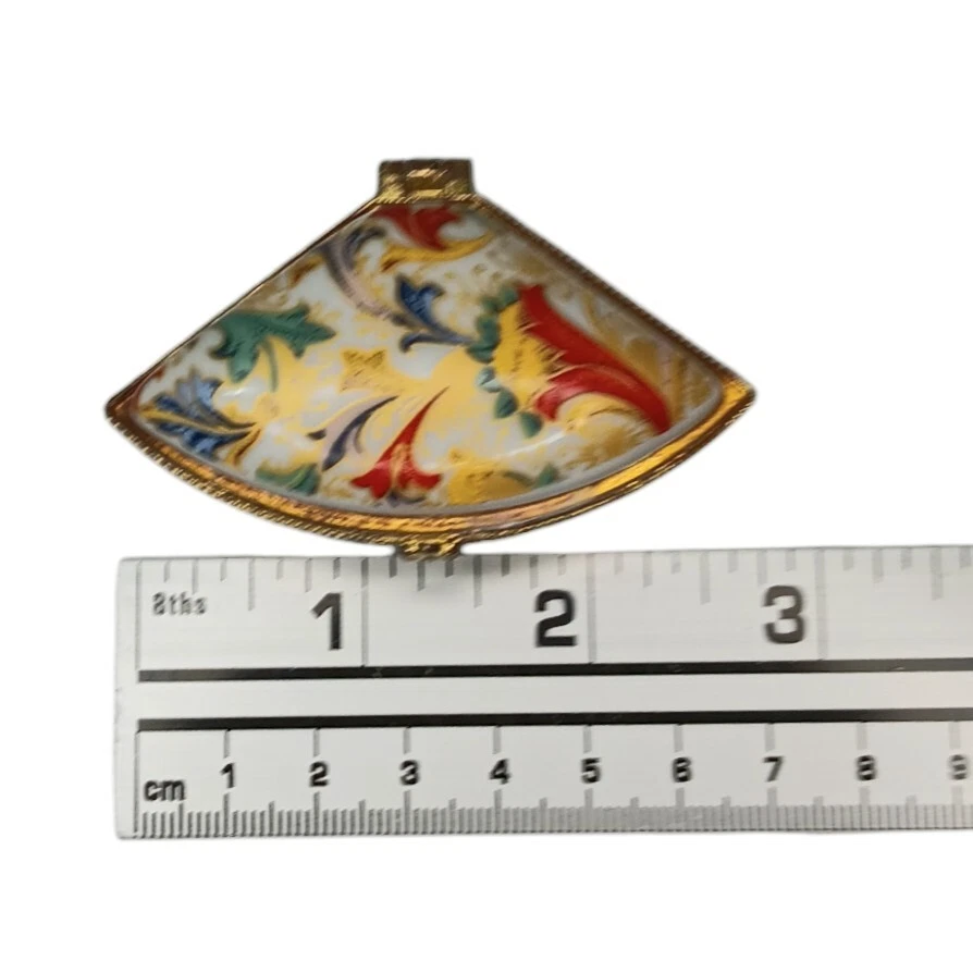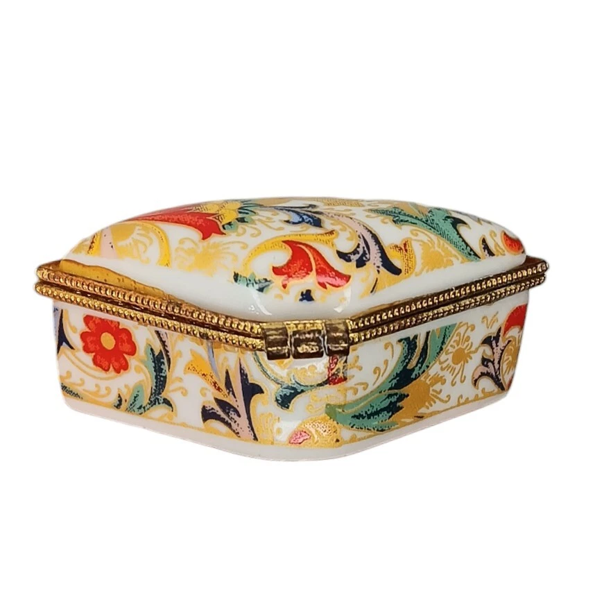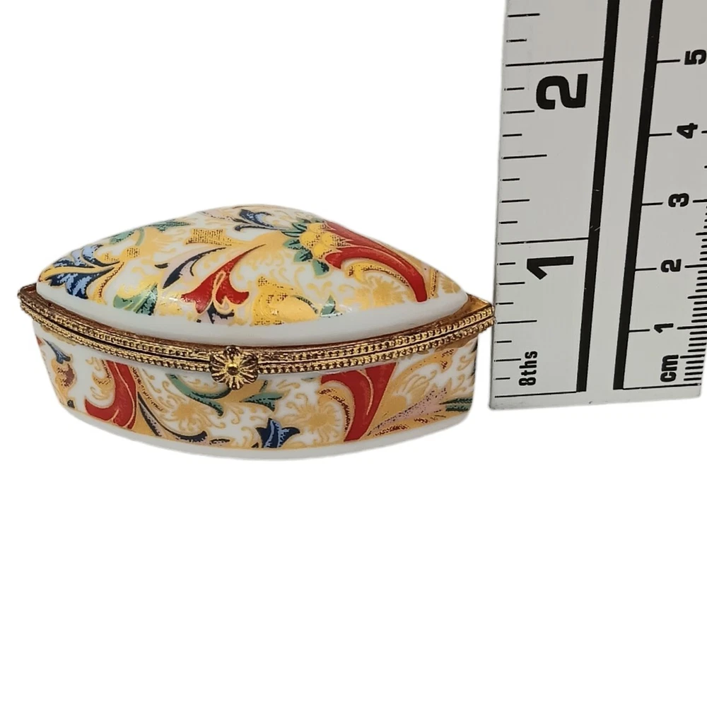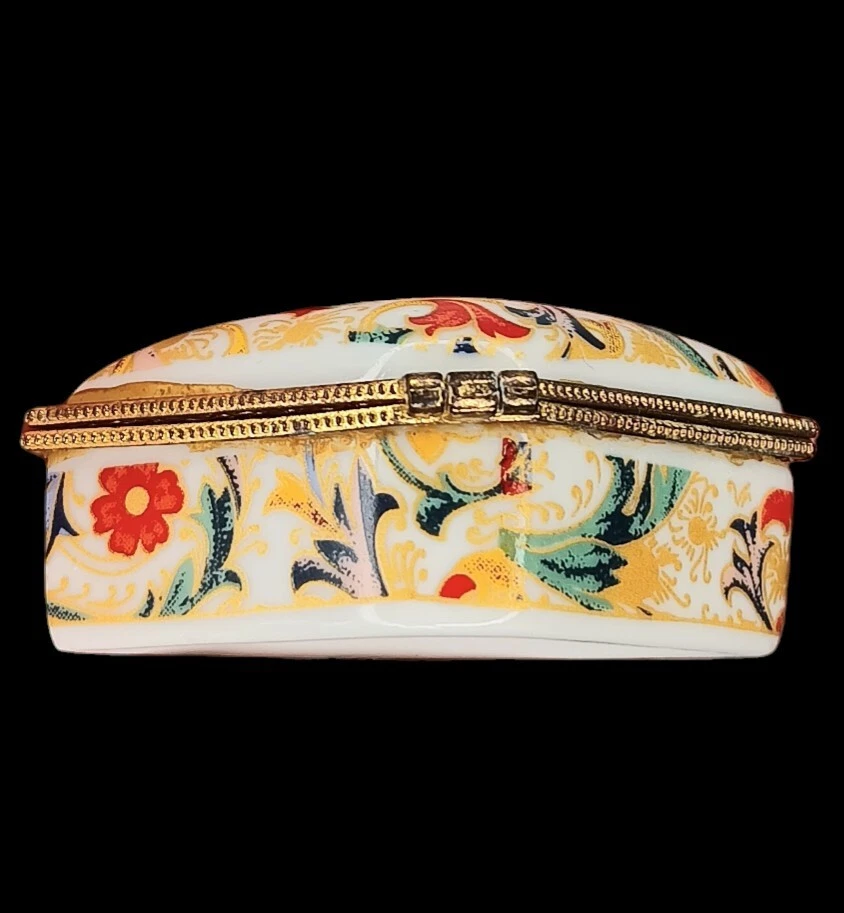Porcelain Floral Paisley Hinged Ceramic Pill Box Trinket Box Red Yellow Gold Approximately 1" x 2.5" Excellent condition