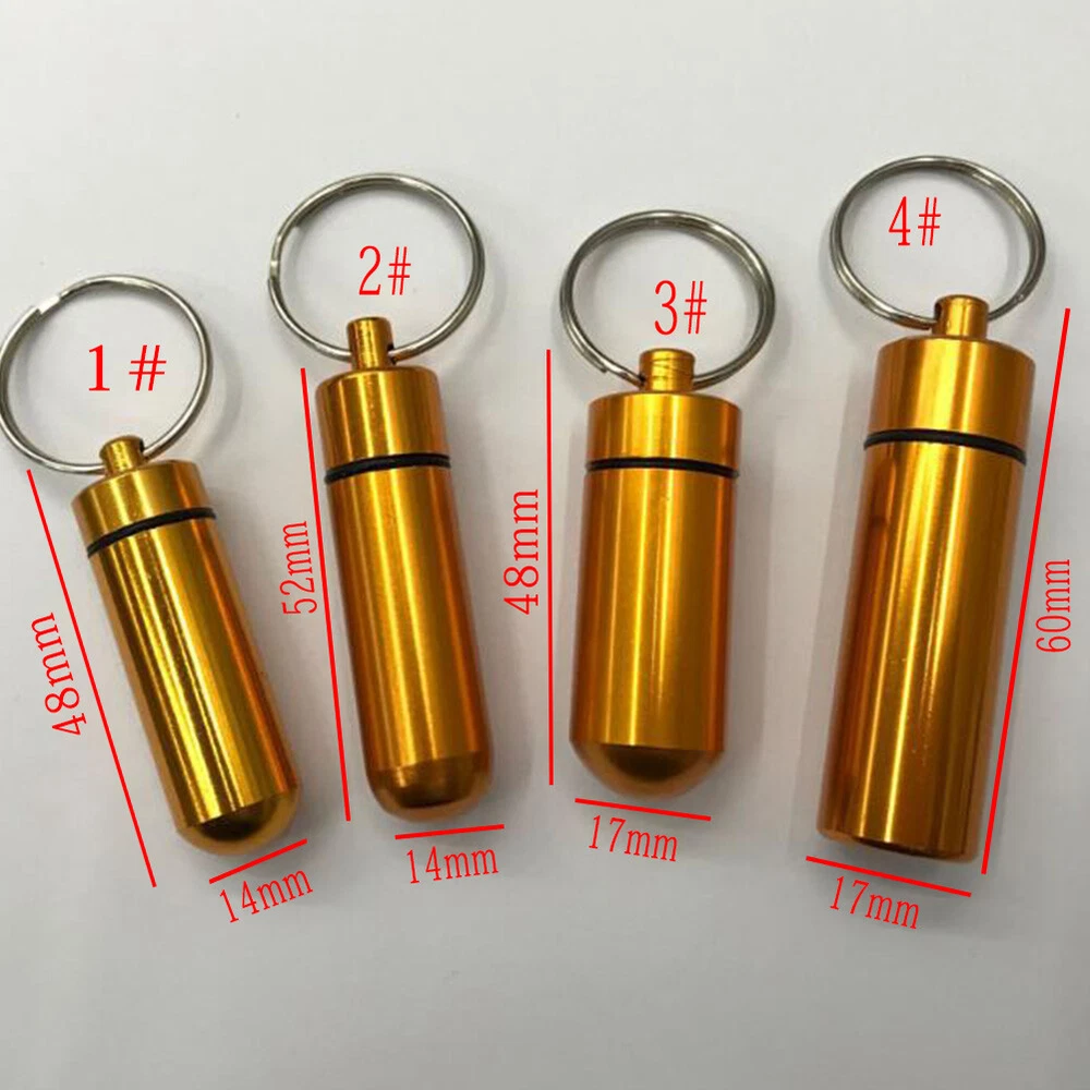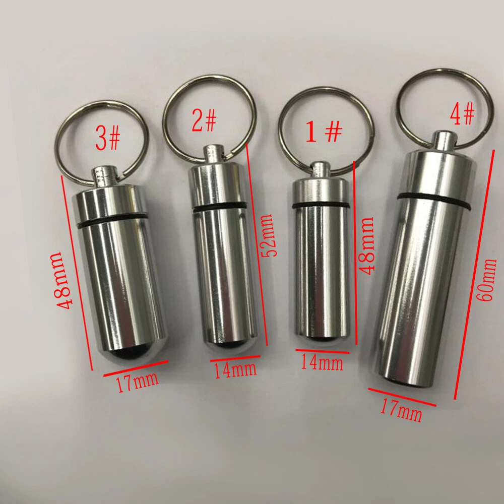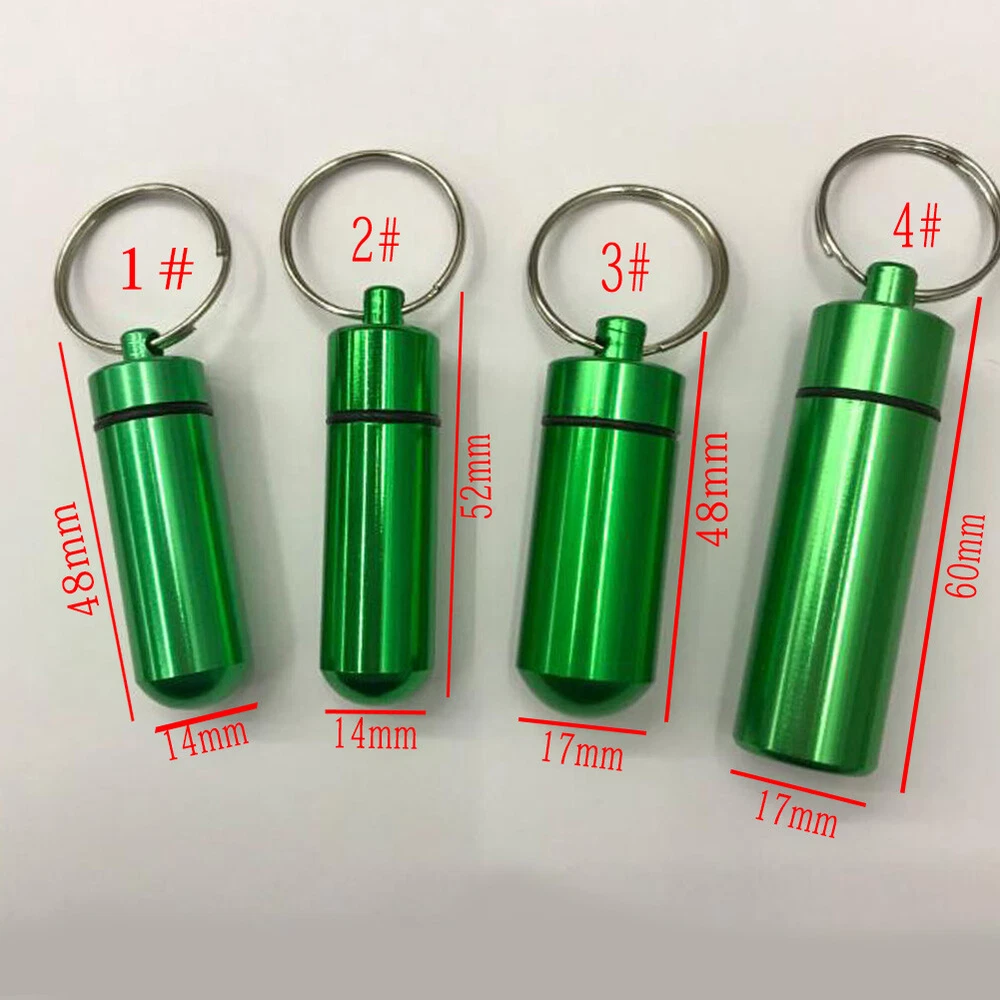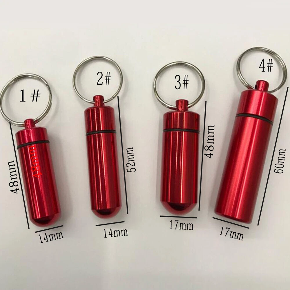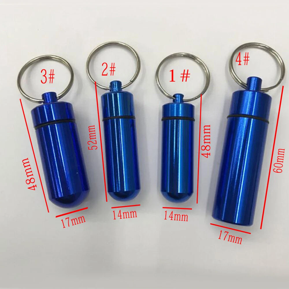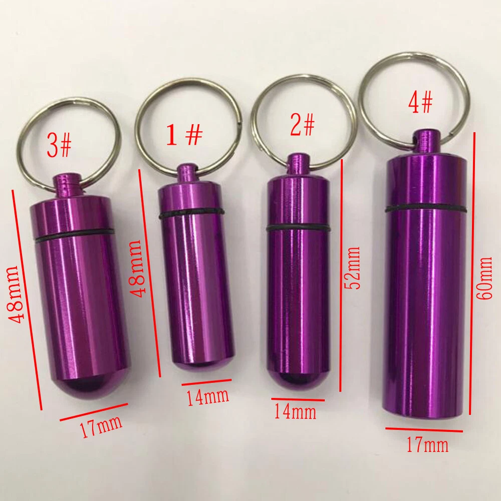 Mini Waterproof Metal Keychain Outdoor Travel Portable Pill Bottle Key Ring Mini Waterproof Metal Keychain Outdoor Travel Portable Pill Bottle Key Ring Feature: 1. 100% brand new and high quality. 2. Waterproof and wear-resisting, the cover can be unscrewed, the inside of the cartridge is very clean, can be filled with emergency tablets, or commonly used tablets, small firestone, fishing hook and line and other survival equipment, with hanging ring, easy to use. 3. It can be used as a key decoration, very convenient to carry. 4. It is suitable for hunting, fishing, camping, adventure, life saving and other outdoor activities or household use. 5. In addition, personal information can be placed in it to carry (name, contact person in case of emergency, telephone number, and previous history of drug allergy, which can be hung on children or elderly people with no ability to help themselves, so as to facilitate contact with relatives when lost). Specification: Item Type:Key Chain Material:Aluminium Alloy Color:Red,Yellow,Blue,Green,Purple,Silver,Black Size:1#:14*48mm/0.55*1.88inch 2#:14*52mm/0.55*2.04inch 3#:17*48mm/0.66*1.88inch 4#:17*60mm/0.66*2.36inch Package:1PC Key chain Note: Please allow1-2cm measuring deviation due to manual measurement. Due to the difference between different monitors, the picture may not reflect the actual color of the item. Thank you!