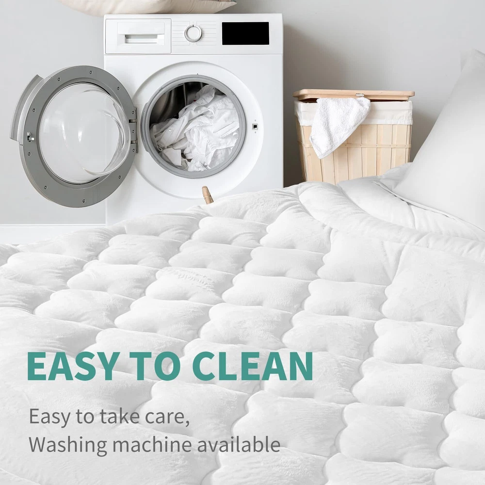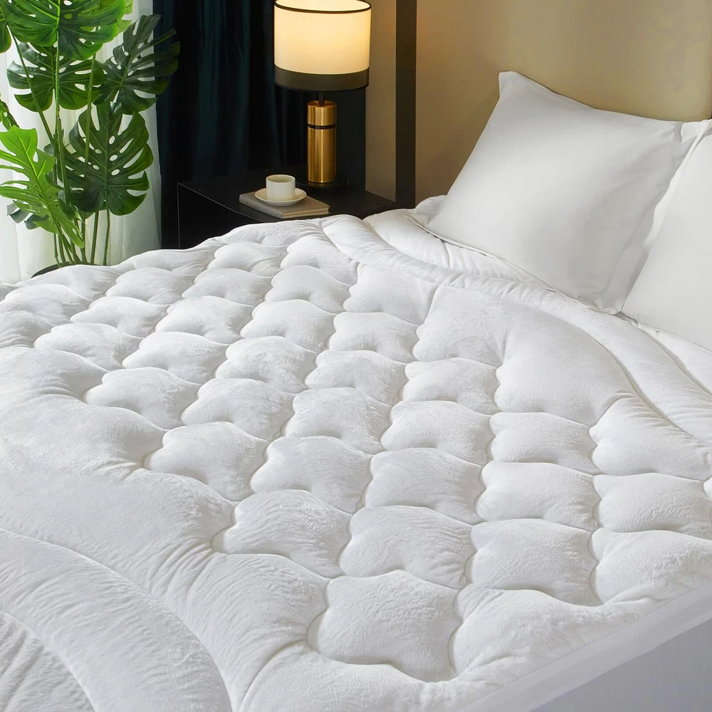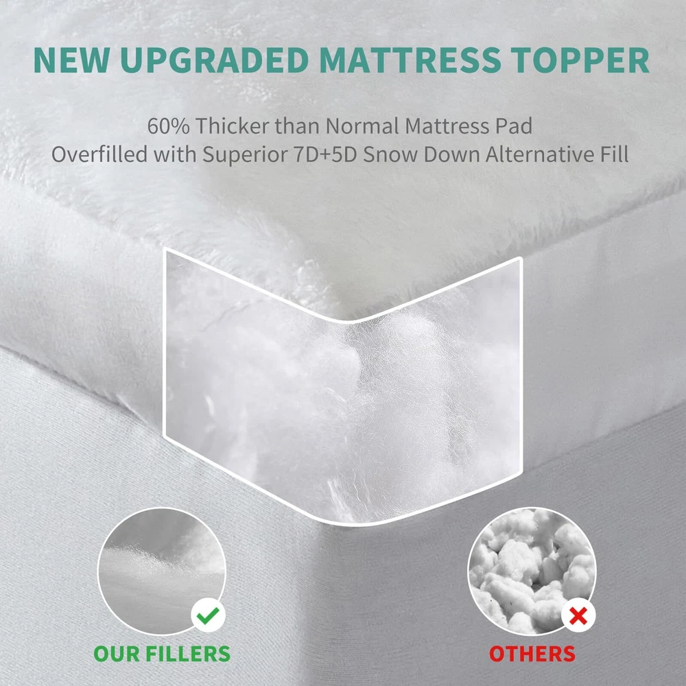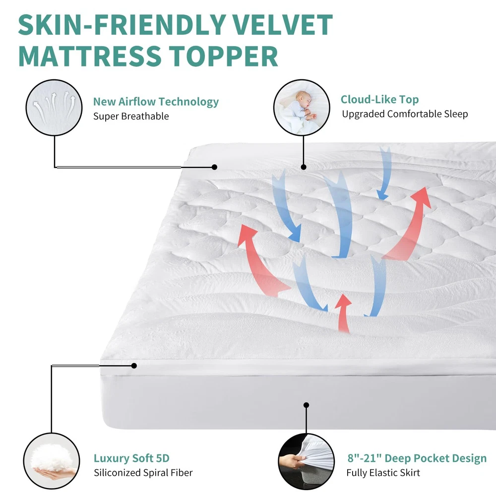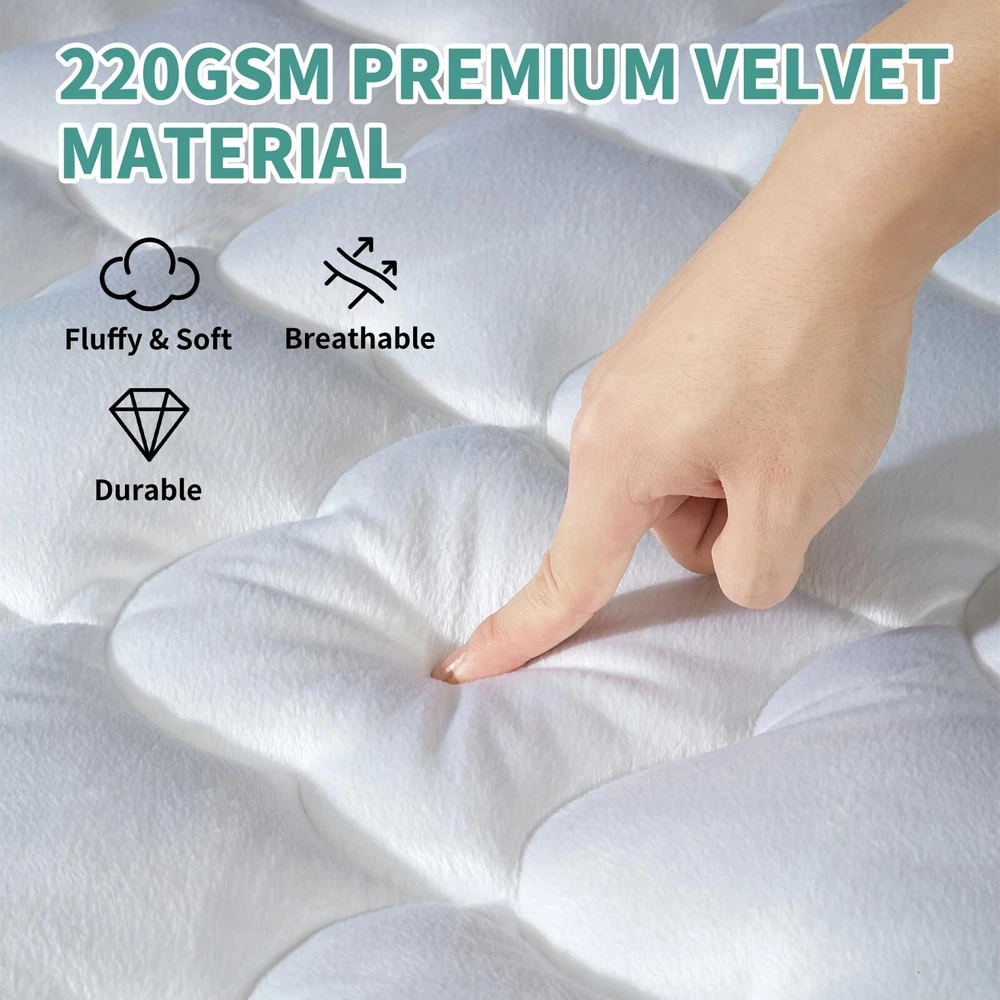 【Extra Thick & Luxury Comfort】Enhance your sleep experience with our luxurious pillow top mattress topper. Designed to provide a deeper and more restful sleep, the King mattress pad filled with supportive 3D snow down alternative fill. This innovative design promotes air circulation, providing a soft and supportive surface without the discomfort of sweat commonly associated with memory foam or traditional mattresses. Enjoy optimal support and a sweat-free sleep experience like never before. 【Cloud-Like Surface & Breathable】Newly developed 220gsm high quality velvet fabric that can make you feel soft & fluffy and get stress-relieving support. Add a touch of elegance to your bedroom with our pillow top mattress topper, featuring a cloud wave surface and double border construction. This design adds a stylish element to your bedroom decor, making it no longer monotonous. With its simple yet elegant design, our King mattress topper is the perfect addition for your bedroom. 【Rejuvenate Your Old Mattress】Recommended for people with firm beds! If your mattress is way too firm, adding our mattress topper cover is a excellent resolution. It will add softness and comfort to old and hard foam mattresses. It's also an affordable upgrade to any bed, rather than buying a high-cost mattress. Use it as if you had a new bed. Package Includes 1 mattress toper: Queen Size 60"x80"+ (8-21") /King Size 78"x80"+(8-21"). 【Deep Pocket Mattress Cover】360° all-around wrapping design, high quality eastic deep pocket is suitable for 8-21" mattresses, without sliding or making noise in any sleeping position. Our mattress topper features a cloud wave quilting fixed-point process with fixed filling, creating a 3D structure on the surface. Ensures the filling is evenly distributed, more durable, plump, and supportive. It is not easy to deform after long-term use. Feel free to relax on a cloud of comfort. 【Machine Washable & Easy Care】Our mattress pads is easy to clean and is fully machine washable,It can be washed in a large capacity washing machine with a gentle circulation of cold water and dried at low temperatures. Not easy to fade, shrink, or tear. But please don't iron or dry clean!
